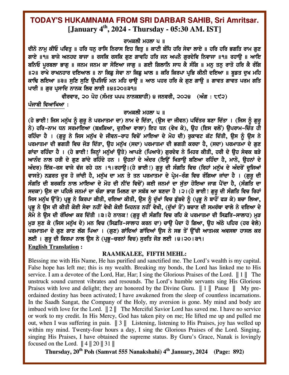 Source : SGPC Post navigation Today’s MUKHWAK Sri Darbar Saheb Amritsar – January 3rd, 2024 Today’s MUKHWAK Sri Darbar Saheb Amritsar – January 5th, 2024