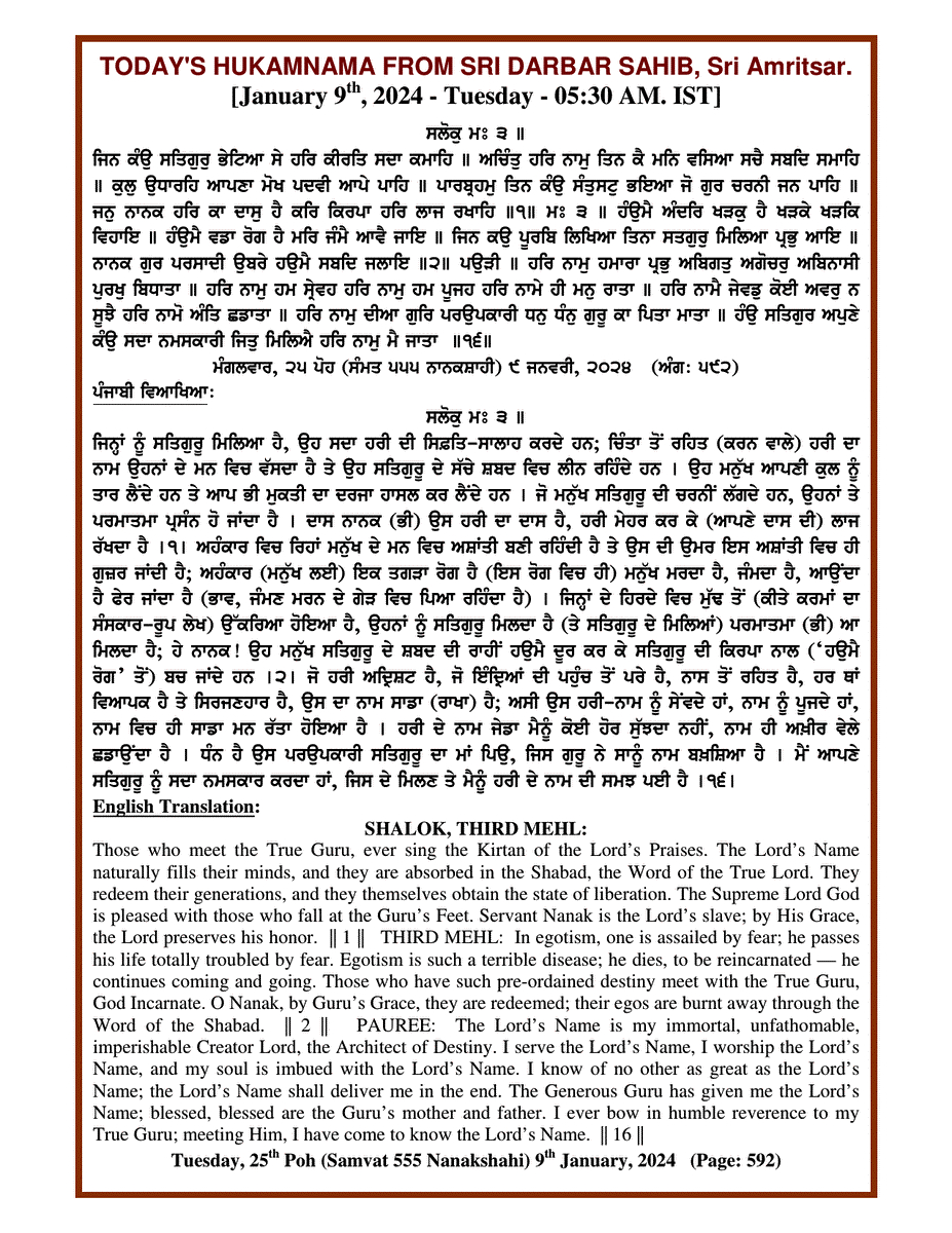 Source : SGPC Post navigation Today’s MUKHWAK Sri Darbar Saheb Amritsar – January 8th, 2024 Today’s MUKHWAK Sri Darbar Saheb Amritsar – January 10th, 2024