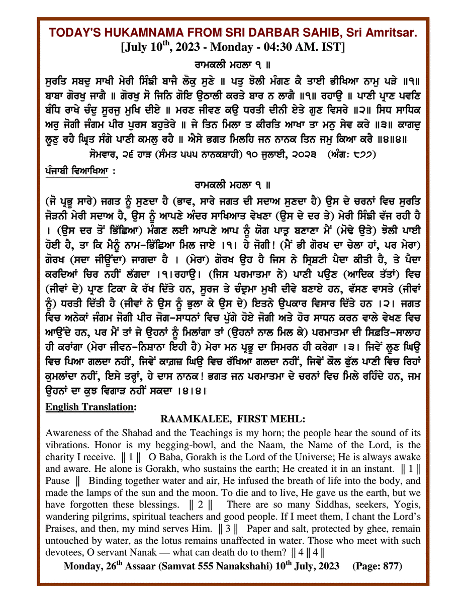 Source : SGPC Post navigation Today’s MUKHWAK Sri Darbar Saheb Amritsar – July 9th, 2023 Today’s MUKHWAK Sri Darbar Saheb Amritsar – July 11th, 2023