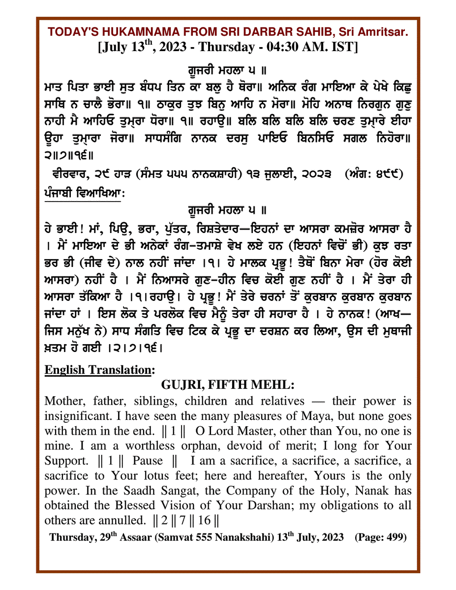 Source : SGPC Post navigation Today’s MUKHWAK Sri Darbar Saheb Amritsar – July 12th, 2023 Today’s MUKHWAK Sri Darbar Saheb Amritsar – July 14th, 2023