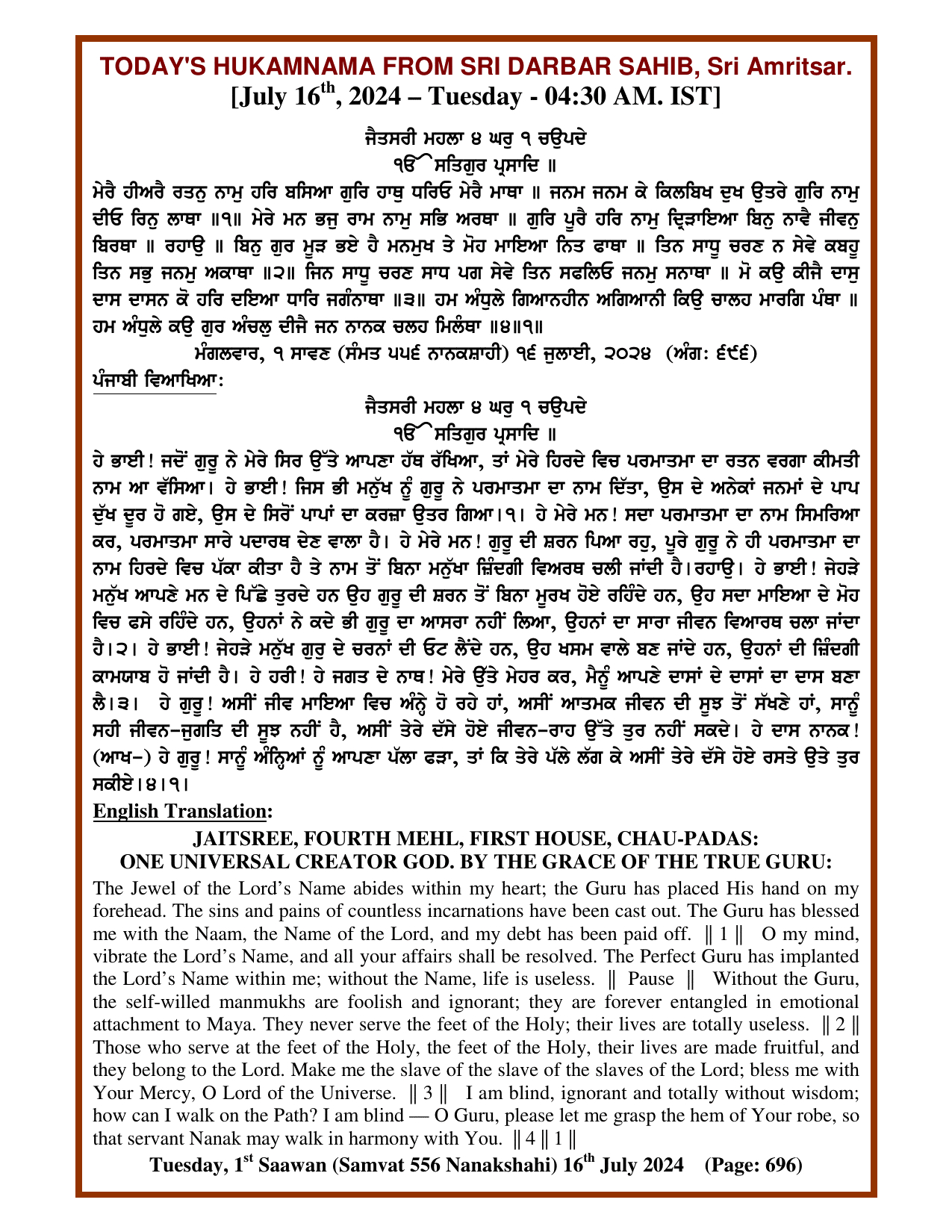 Source : SGPC Post navigation Today’s MUKHWAK Sri Darbar Saheb Amritsar – July 15th, 2024 Today’s MUKHWAK Sri Darbar Saheb Amritsar – July 17th, 2024