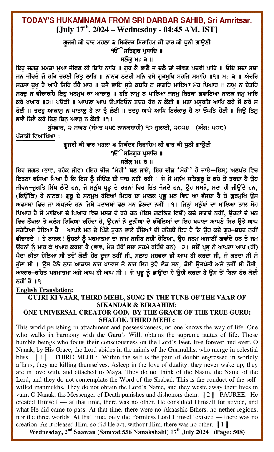 Source : SGPC Post navigation Today’s MUKHWAK Sri Darbar Saheb Amritsar – July 16th, 2024 Today’s MUKHWAK Sri Darbar Saheb Amritsar – July 18th, 2024