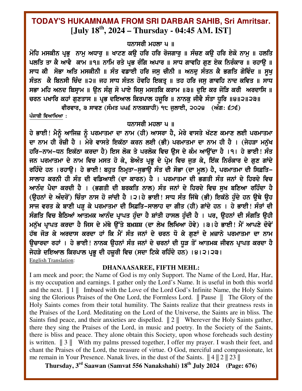 Source : SGPC Post navigation Today’s MUKHWAK Sri Darbar Saheb Amritsar – July 17th, 2024 Today’s MUKHWAK Sri Darbar Saheb Amritsar – July 19th, 2024