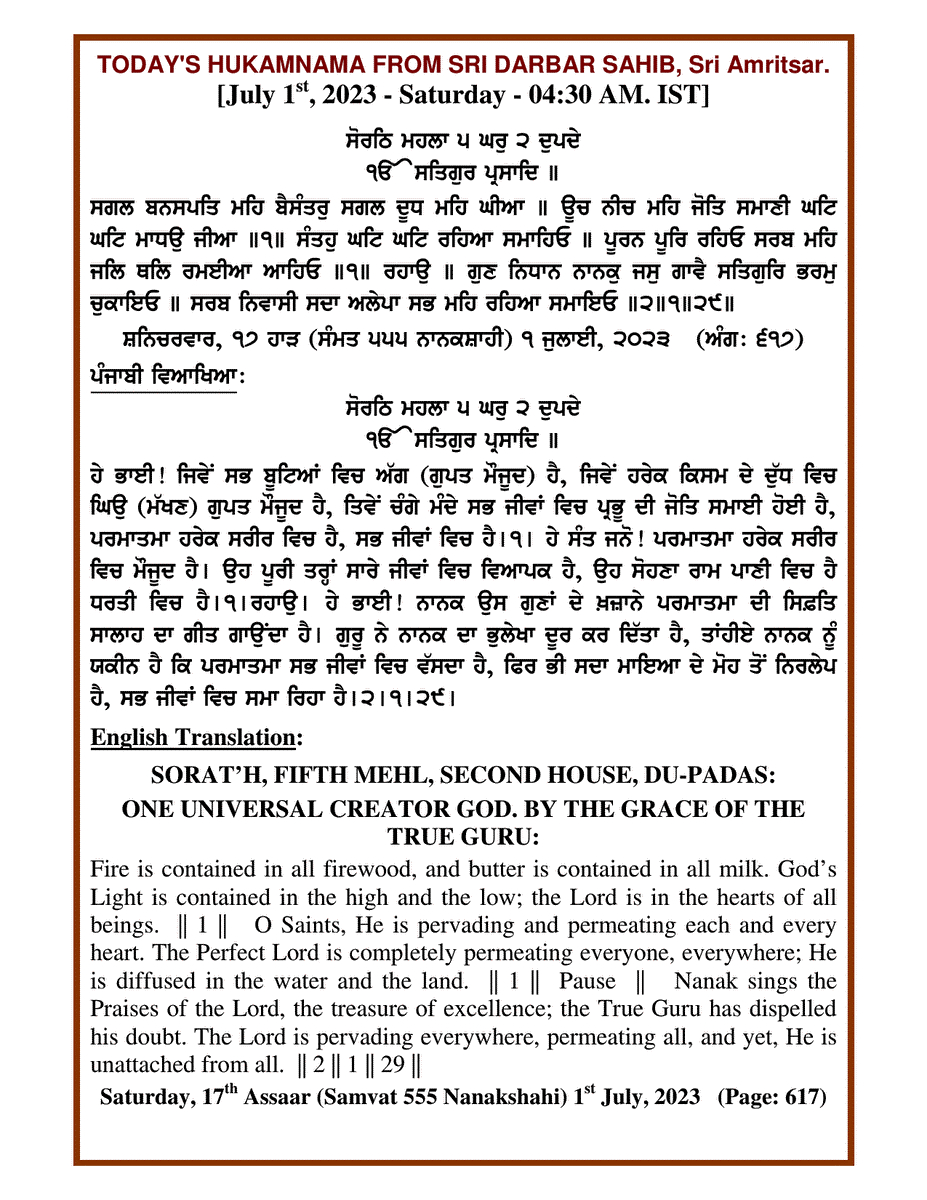 Source : SGPC Post navigation Today’s MUKHWAK Sri Darbar Saheb Amritsar – June 30th, 2023 Today’s MUKHWAK Sri Darbar Saheb Amritsar – July 2nd, 2023