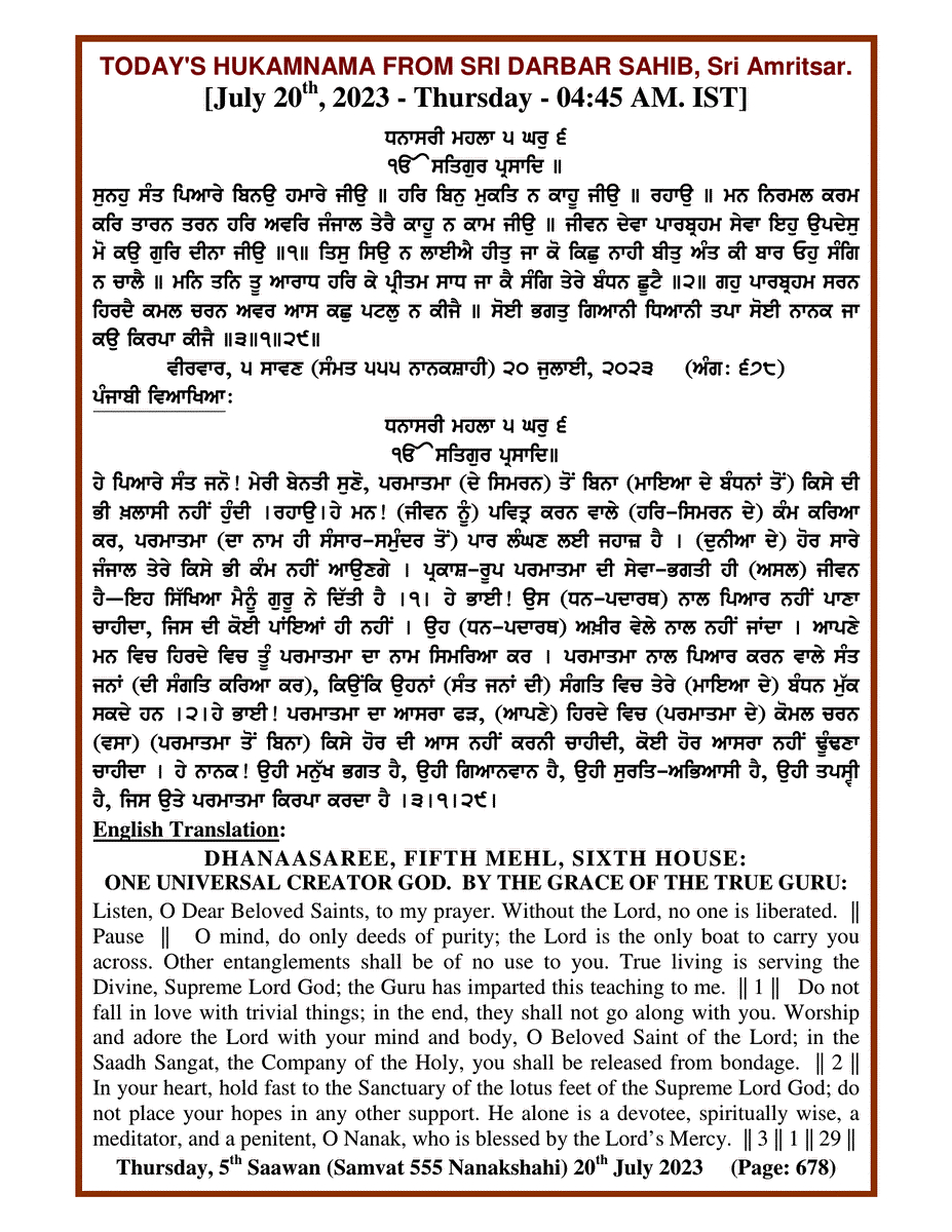 Source : SGPC Post navigation Today’s MUKHWAK Sri Darbar Saheb Amritsar – July 19th, 2023 Today’s MUKHWAK Sri Darbar Saheb Amritsar – July 21st, 2023