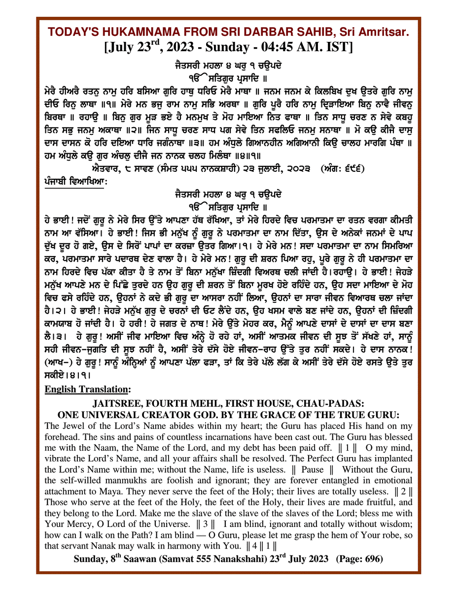 Source : SGPC Post navigation Today’s MUKHWAK Sri Darbar Saheb Amritsar – July 22nd, 2023 Today’s MUKHWAK Sri Darbar Saheb Amritsar – July 24th, 2023