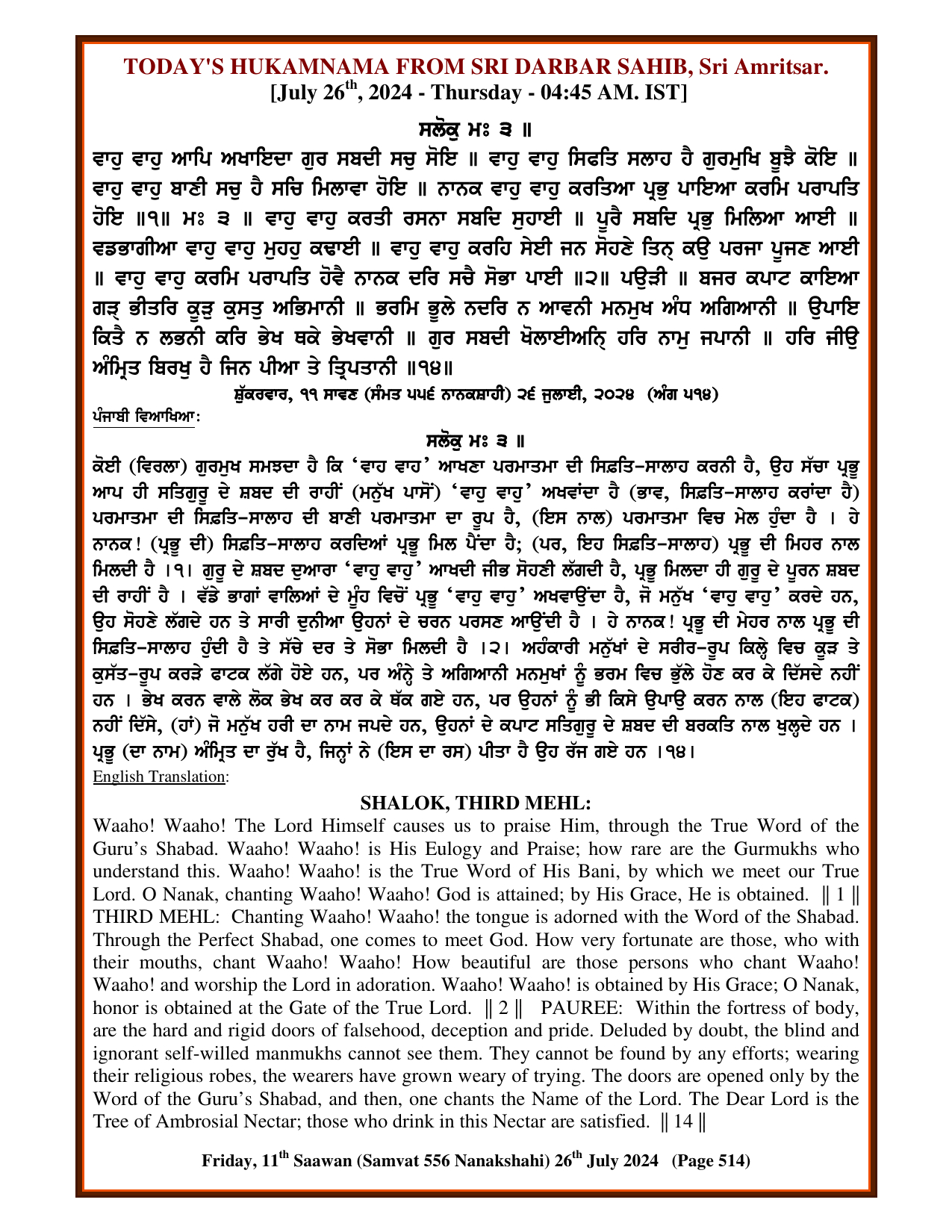 Source : SGPC Post navigation Today’s MUKHWAK Sri Darbar Saheb Amritsar – July 25th, 2024 Today’s MUKHWAK Sri Darbar Saheb Amritsar – July 27th, 2024