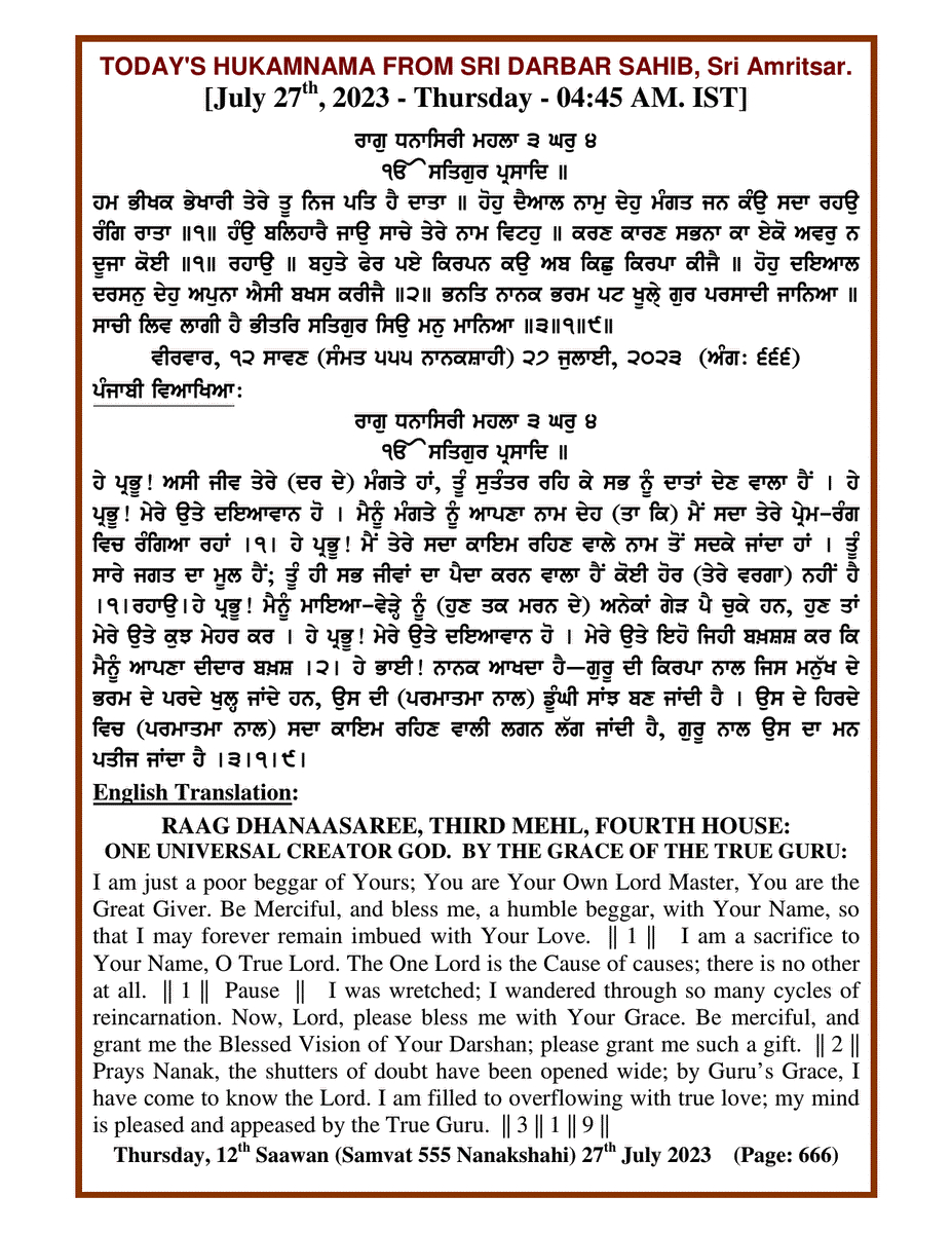 Source : SGPC Post navigation Today’s MUKHWAK Sri Darbar Saheb Amritsar – July 26th, 2023 Today’s MUKHWAK Sri Darbar Saheb Amritsar – July 28th, 2023