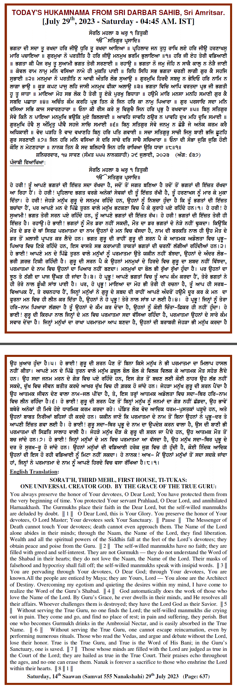 Source : SGPC Post navigation Today’s MUKHWAK Sri Darbar Saheb Amritsar – July 28th, 2023 Today’s MUKHWAK Sri Darbar Saheb Amritsar – July 30th, 2023