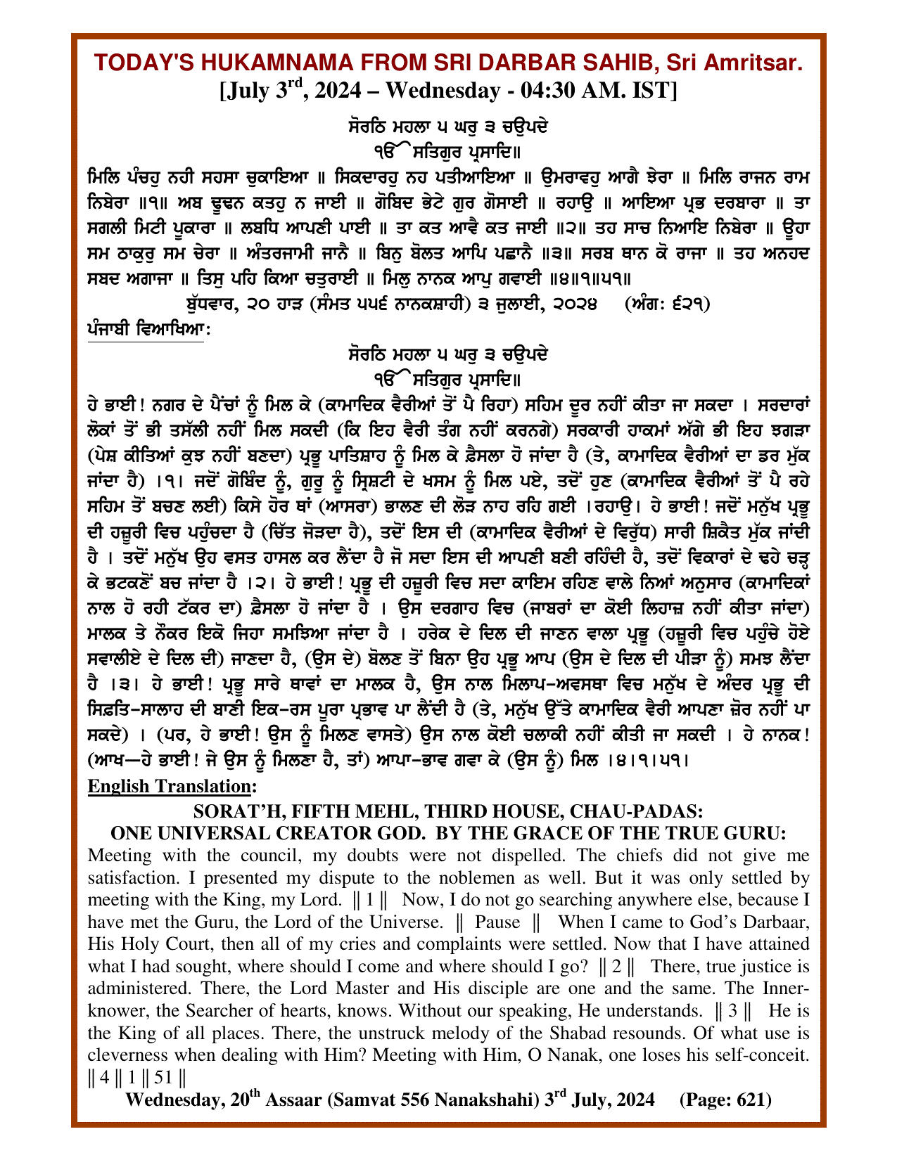 Source : SGPC Post navigation Today’s MUKHWAK Sri Darbar Saheb Amritsar – July 2nd, 2024 Today’s MUKHWAK Sri Darbar Saheb Amritsar – July 4th, 2024