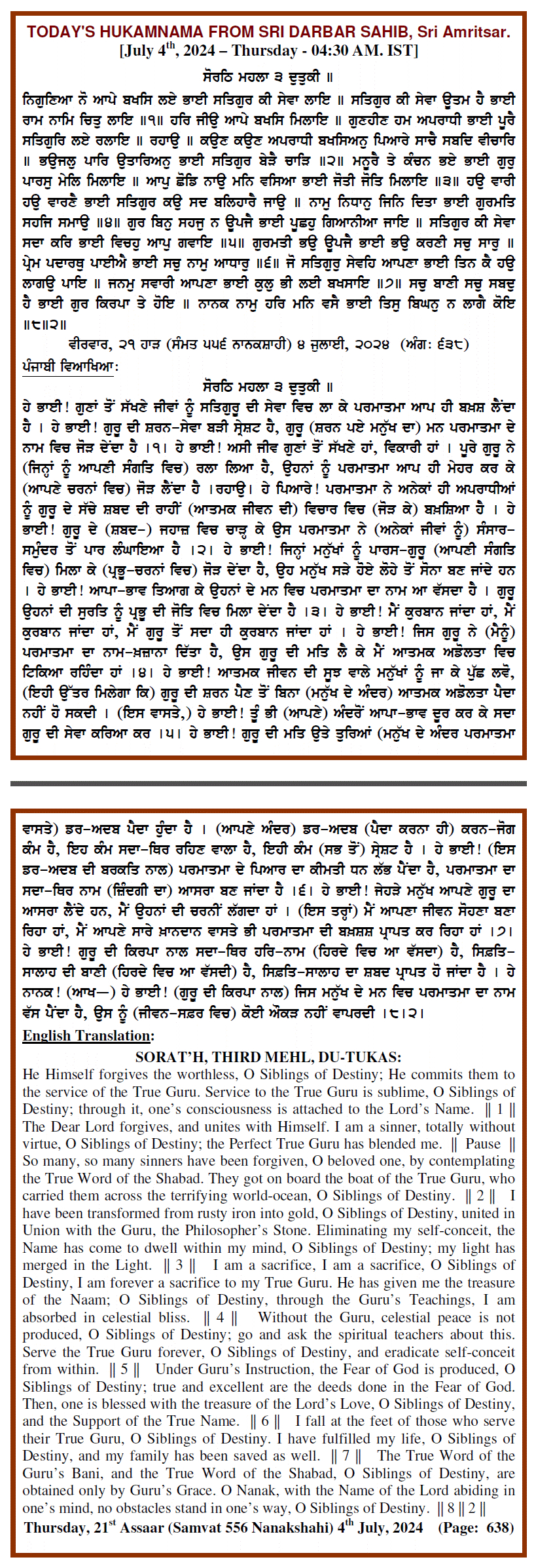 Source : SGPC Post navigation Today’s MUKHWAK Sri Darbar Saheb Amritsar – July 3rd, 2024 Today’s MUKHWAK Sri Darbar Saheb Amritsar – July 5th, 2024