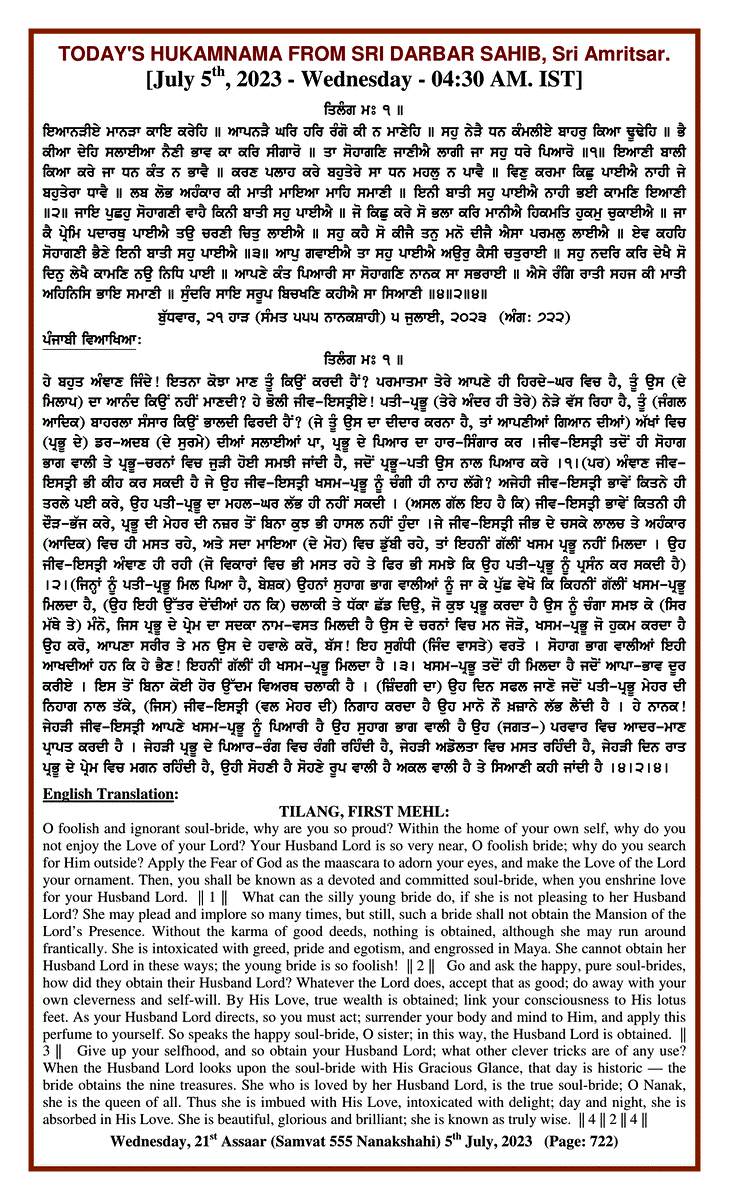 Source : SGPC Post navigation Today’s MUKHWAK Sri Darbar Saheb Amritsar – July 4th, 2023 Today’s MUKHWAK Sri Darbar Saheb Amritsar – July 6th, 2023