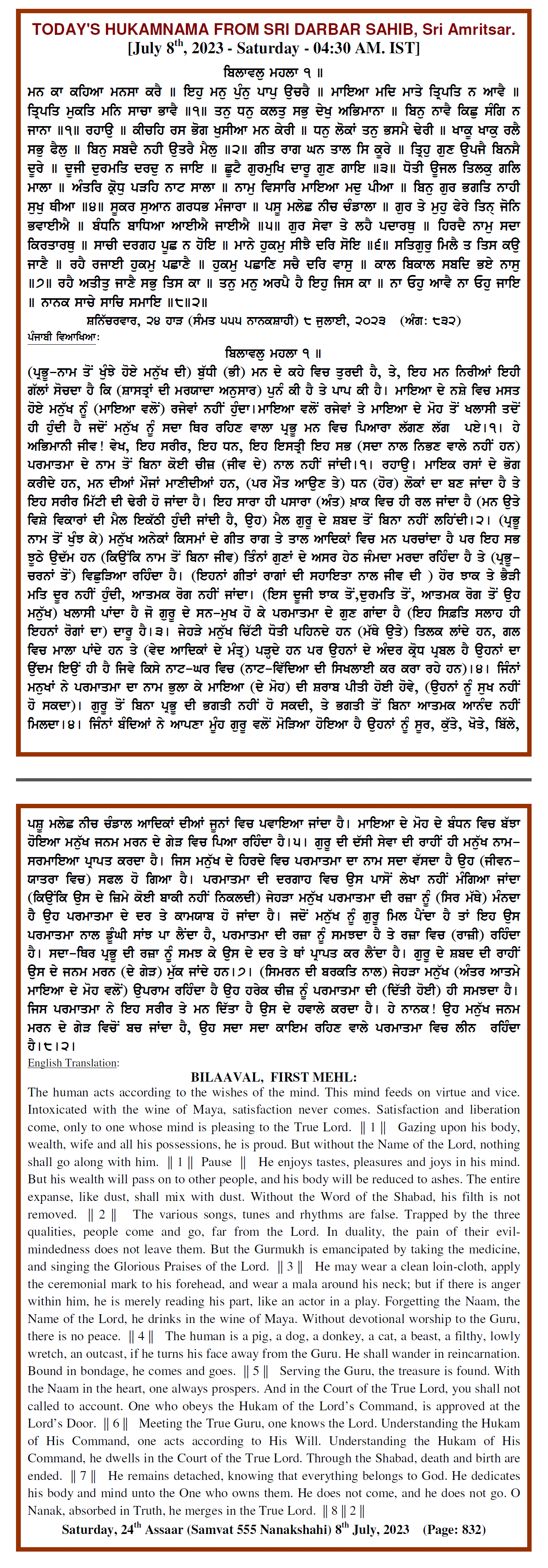 Source : SGPC Post navigation Today’s MUKHWAK Sri Darbar Saheb Amritsar – July 7th, 2023 Today’s MUKHWAK Sri Darbar Saheb Amritsar – July 9th, 2023