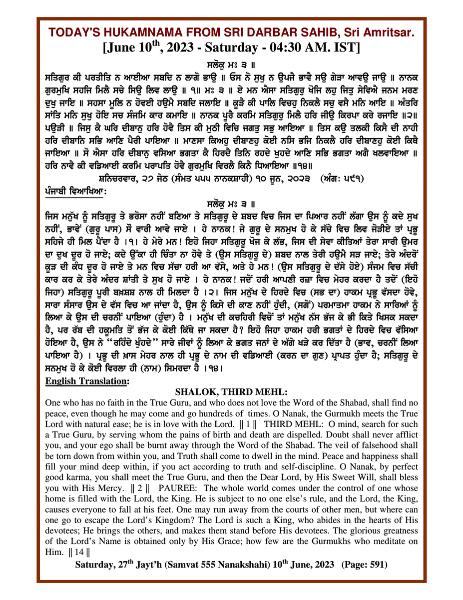 Source : SGPC Post navigation Today’s MUKHWAK Sri Darbar Saheb Amritsar – June 9th, 2023 Today’s MUKHWAK Sri Darbar Saheb Amritsar – June 11th, 2023