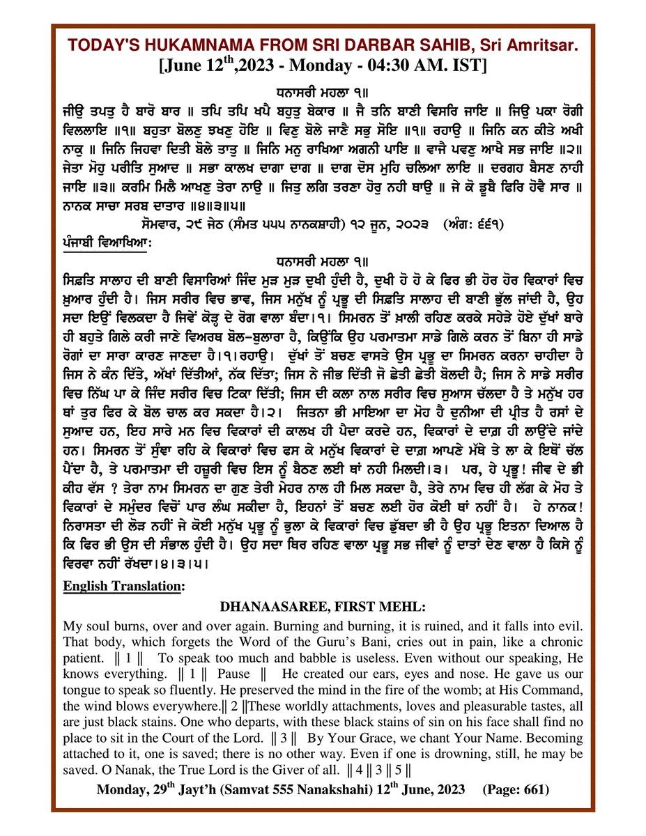 Source : SGPC Post navigation Today’s MUKHWAK Sri Darbar Saheb Amritsar – June 11th, 2023 Today’s MUKHWAK Sri Darbar Saheb Amritsar – June 13th, 2023