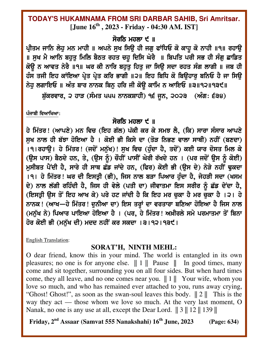 Source : SGPC Post navigation Today’s MUKHWAK Sri Darbar Saheb Amritsar – June 15th, 2023 Today’s MUKHWAK Sri Darbar Saheb Amritsar – June 17th, 2023