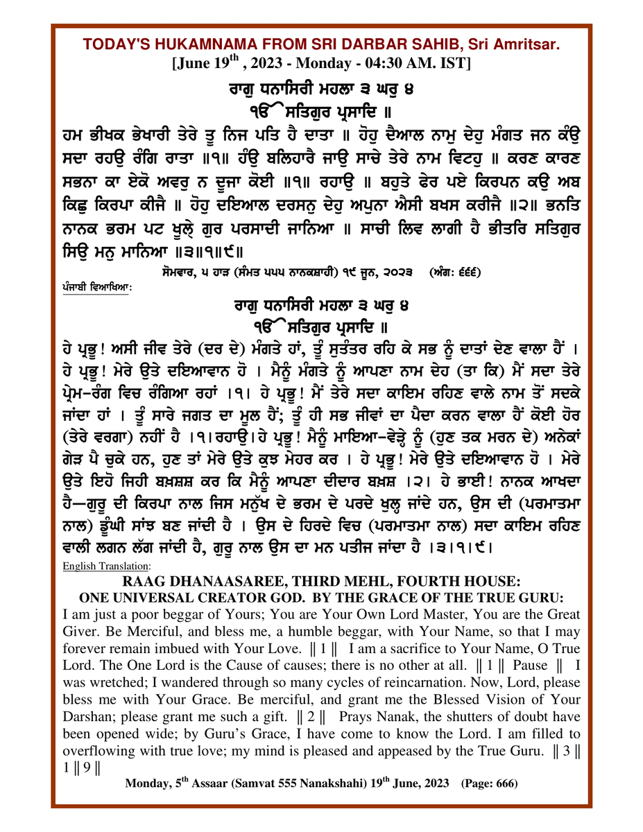 Source : SGPC Post navigation Today’s MUKHWAK Sri Darbar Saheb Amritsar – June 18th, 2023 Today’s MUKHWAK Sri Darbar Saheb Amritsar – June 20th, 2023