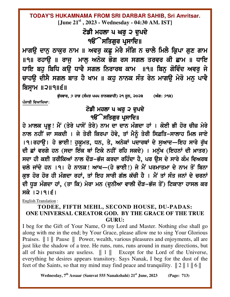 Source : SGPC Post navigation Today’s MUKHWAK Sri Darbar Saheb Amritsar – June 20th, 2023 Today’s MUKHWAK Sri Darbar Saheb Amritsar – June 22nd, 2023