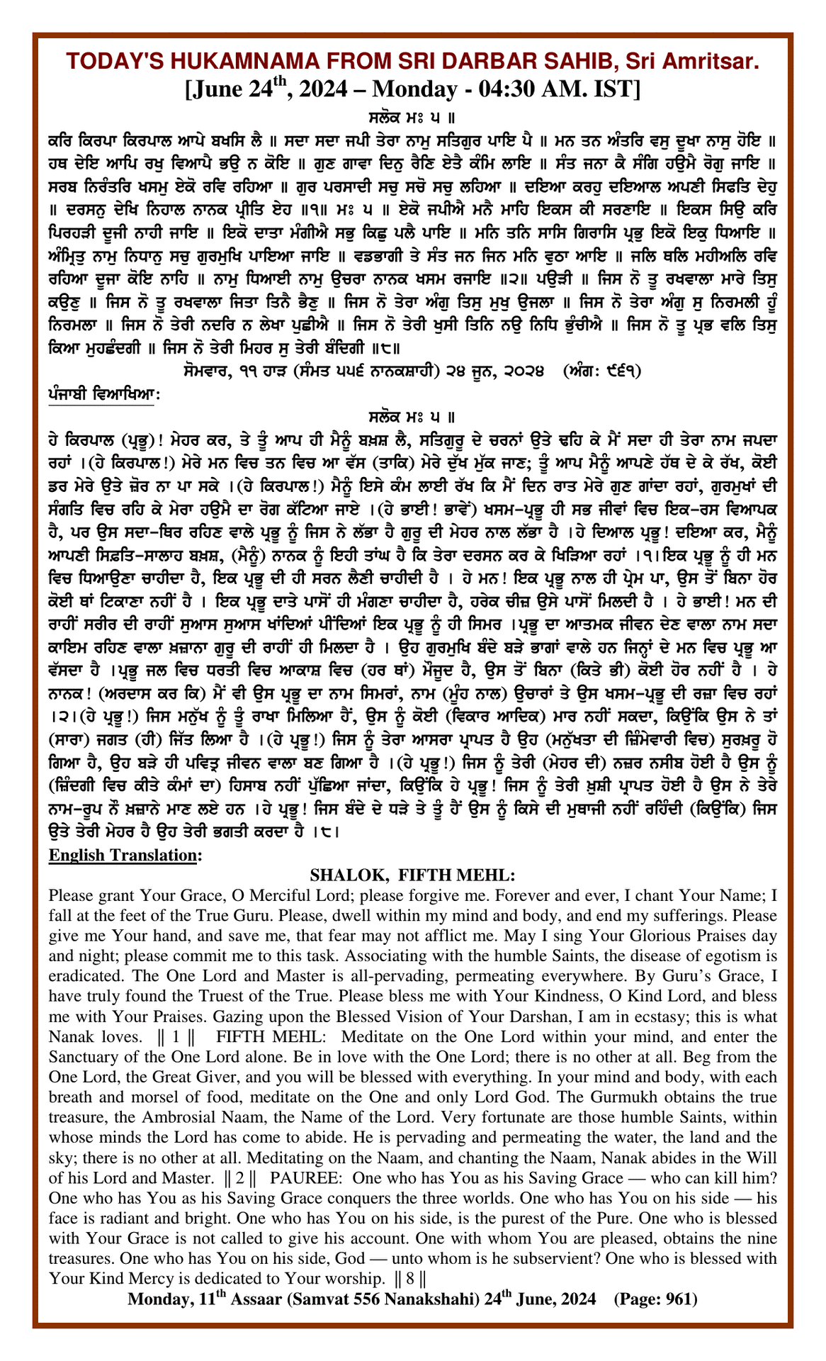 Source : SGPC Post navigation Today’s MUKHWAK Sri Darbar Saheb Amritsar – June 23rd, 2024 Today’s MUKHWAK Sri Darbar Saheb Amritsar – June 25th, 2024