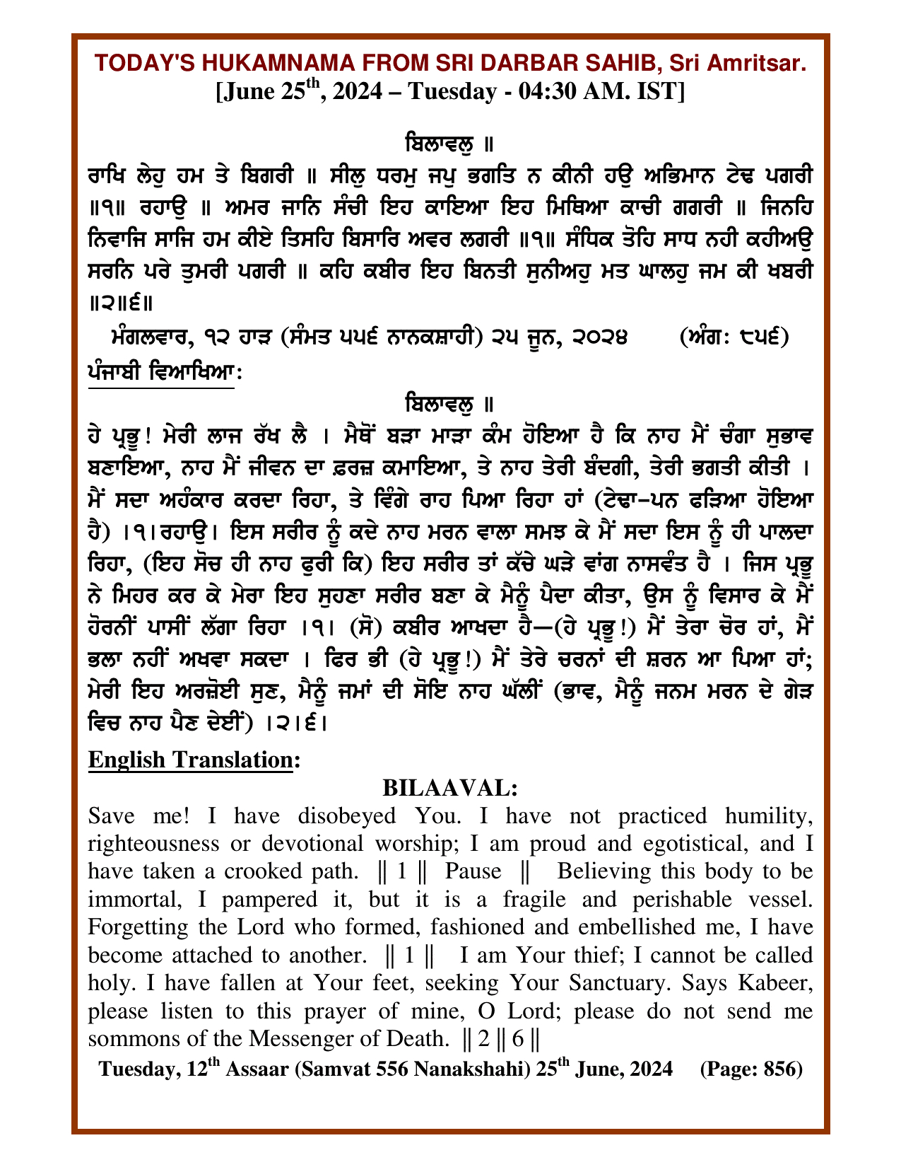 Source : SGPC Post navigation Today’s MUKHWAK Sri Darbar Saheb Amritsar – June 24th, 2024 Today’s MUKHWAK Sri Darbar Saheb Amritsar – June 26th, 2024