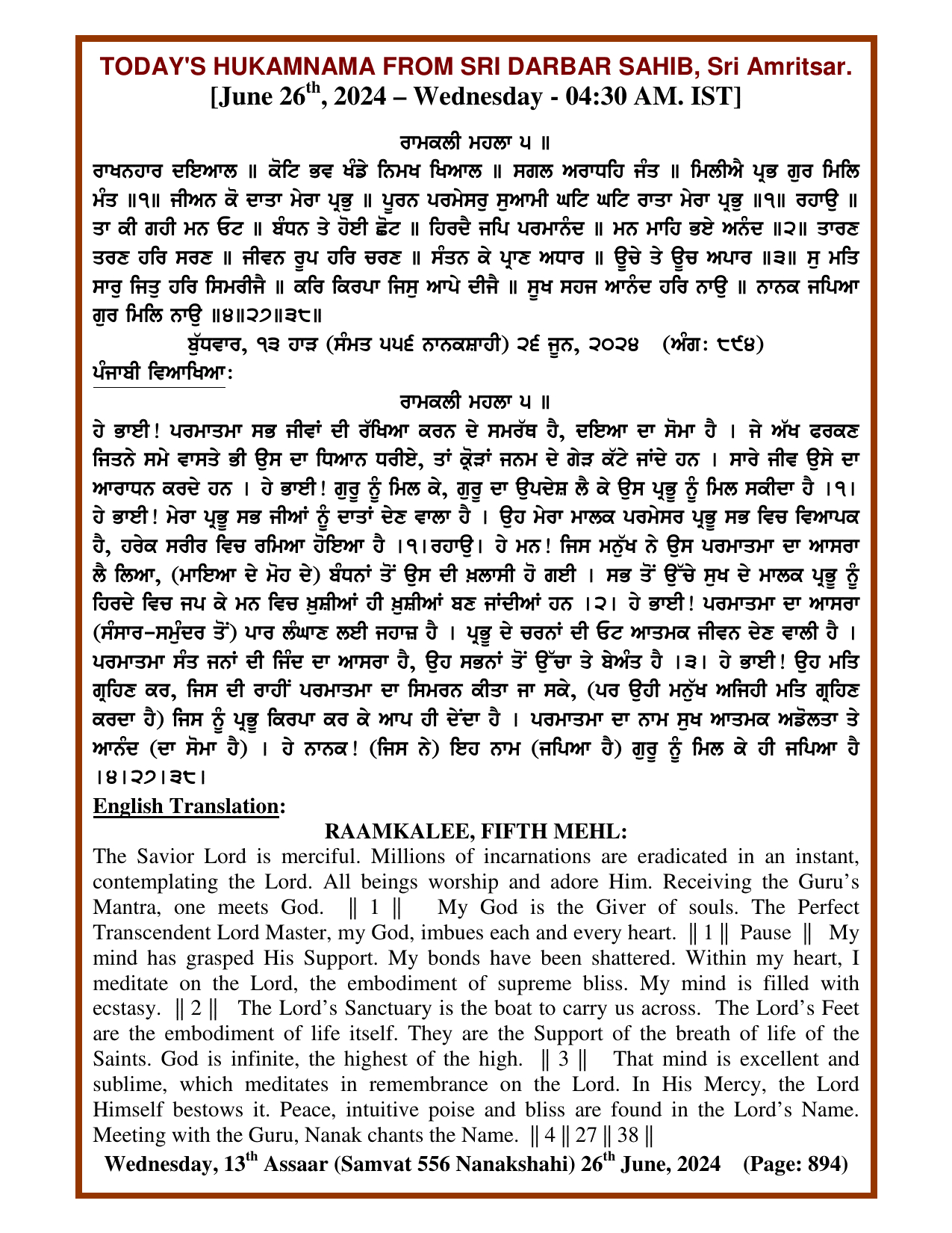 Source : SGPC Post navigation Today’s MUKHWAK Sri Darbar Saheb Amritsar – June 25th, 2024 Today’s MUKHWAK Sri Darbar Saheb Amritsar – June 27th, 2024
