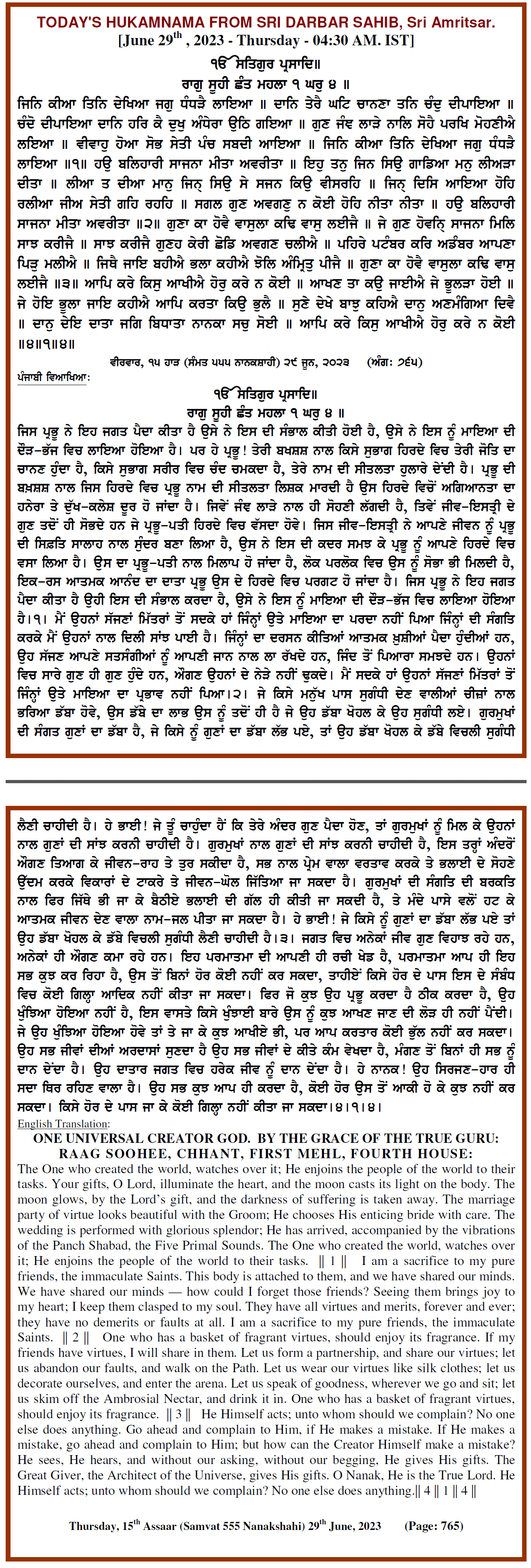 Source : SGPC Post navigation Today’s MUKHWAK Sri Darbar Saheb Amritsar – June 28th, 2023 Today’s MUKHWAK Sri Darbar Saheb Amritsar – June 30th, 2023