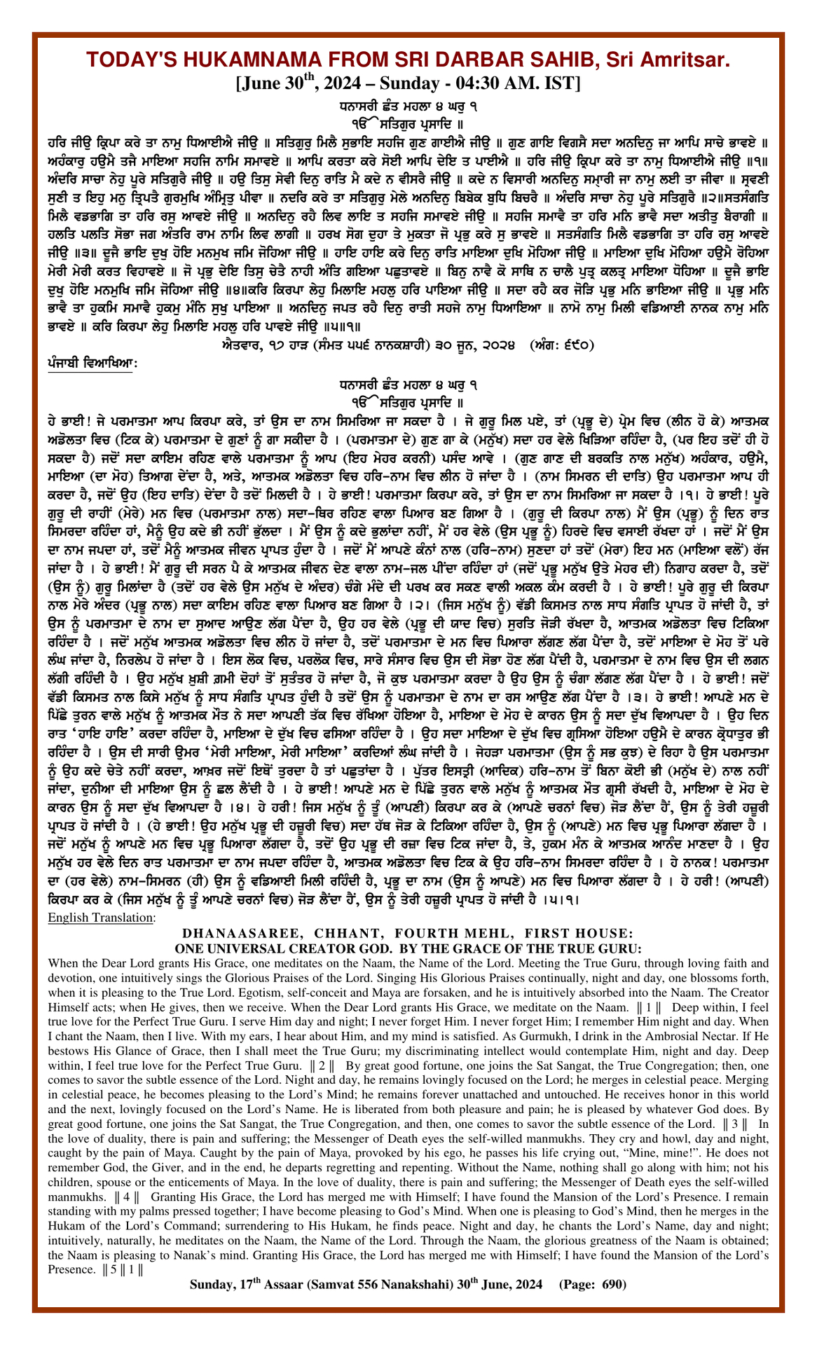 Source : SGPC Post navigation Today’s MUKHWAK Sri Darbar Saheb Amritsar – June 29th, 2024 Today’s MUKHWAK Sri Darbar Saheb Amritsar – July 1st, 2024