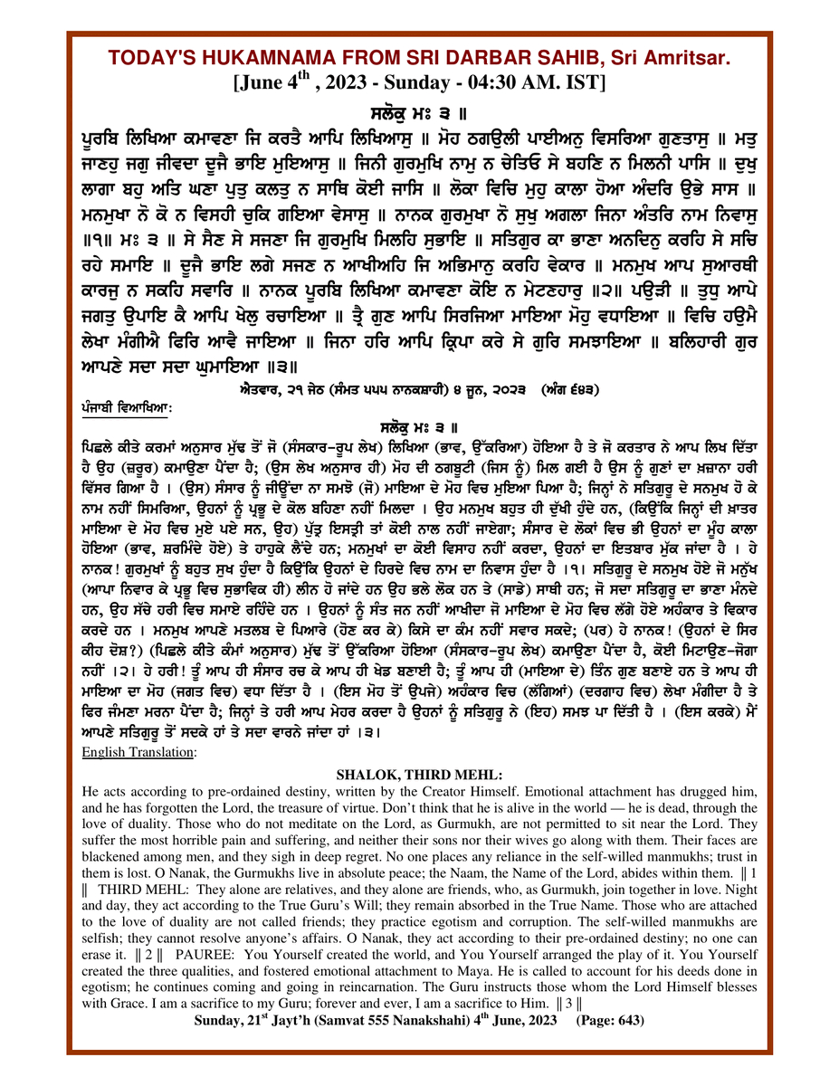 Source : SGPC Post navigation Today’s MUKHWAK Sri Darbar Saheb Amritsar – June 3rd, 2023 Today’s MUKHWAK Sri Darbar Saheb Amritsar – June 5th, 2023