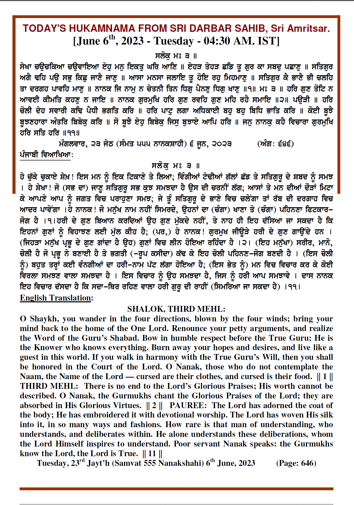 Source : SGPC Post navigation Today’s MUKHWAK Sri Darbar Saheb Amritsar – June 5th, 2023 Today’s MUKHWAK Sri Darbar Saheb Amritsar – June 7th, 2023