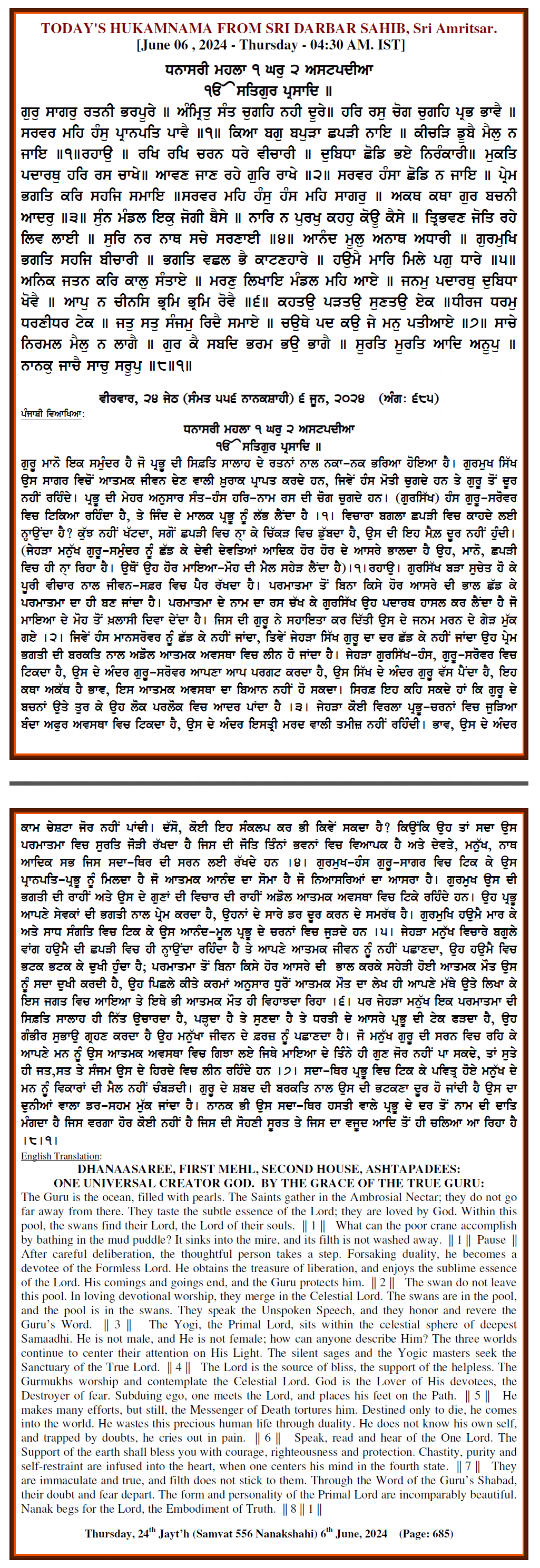Source : SGPC Post navigation Today’s MUKHWAK Sri Darbar Saheb Amritsar – June 5th, 2024 Today’s MUKHWAK Sri Darbar Saheb Amritsar – June 7th, 2024