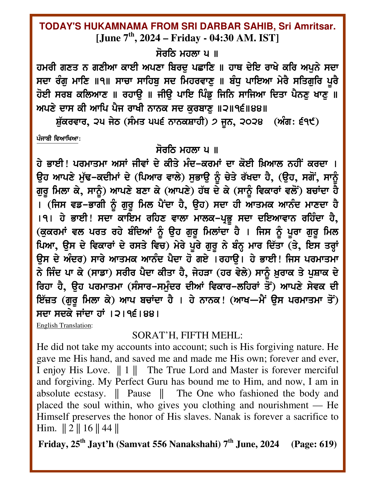 Source : SGPC Post navigation Today’s MUKHWAK Sri Darbar Saheb Amritsar – June 6th, 2024 Today’s MUKHWAK Sri Darbar Saheb Amritsar – June 8th, 2024