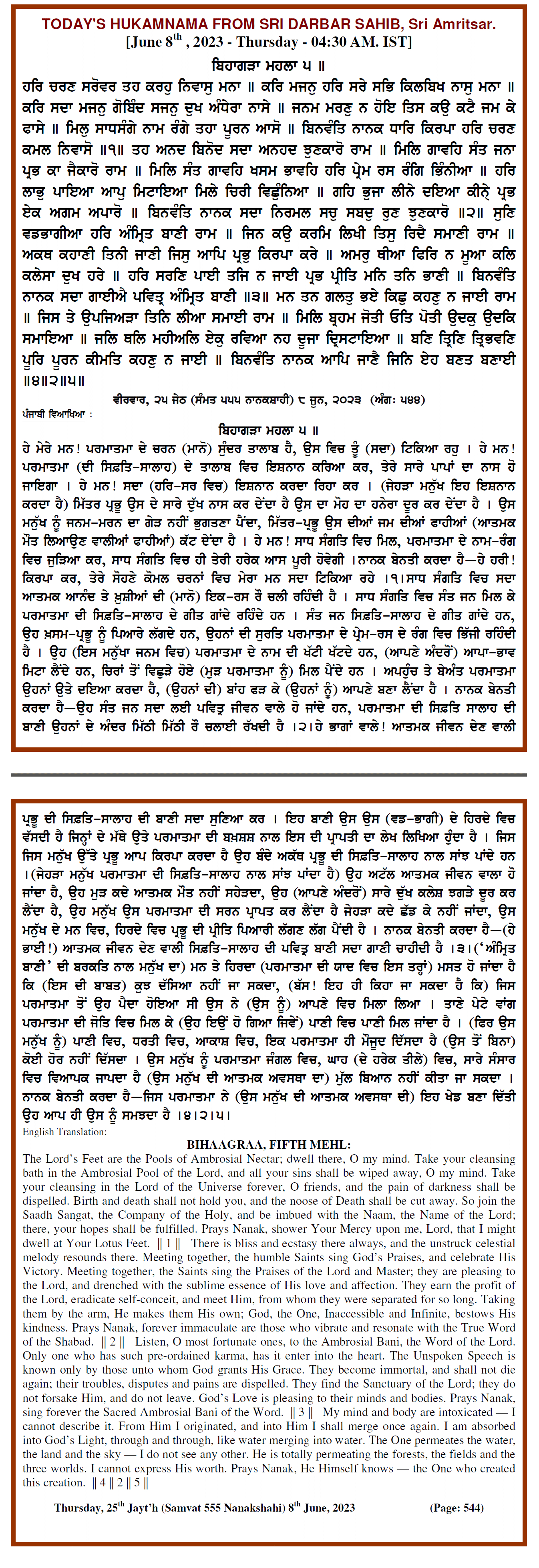 Source : SGPC Post navigation Today’s MUKHWAK Sri Darbar Saheb Amritsar – June 7th, 2023 Today’s MUKHWAK Sri Darbar Saheb Amritsar – June 9th, 2023