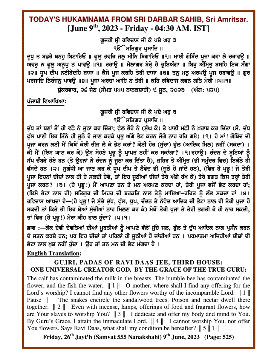 Source : SGPC Post navigation Today’s MUKHWAK Sri Darbar Saheb Amritsar – June 8th, 2023 Today’s MUKHWAK Sri Darbar Saheb Amritsar – June 10th, 2023