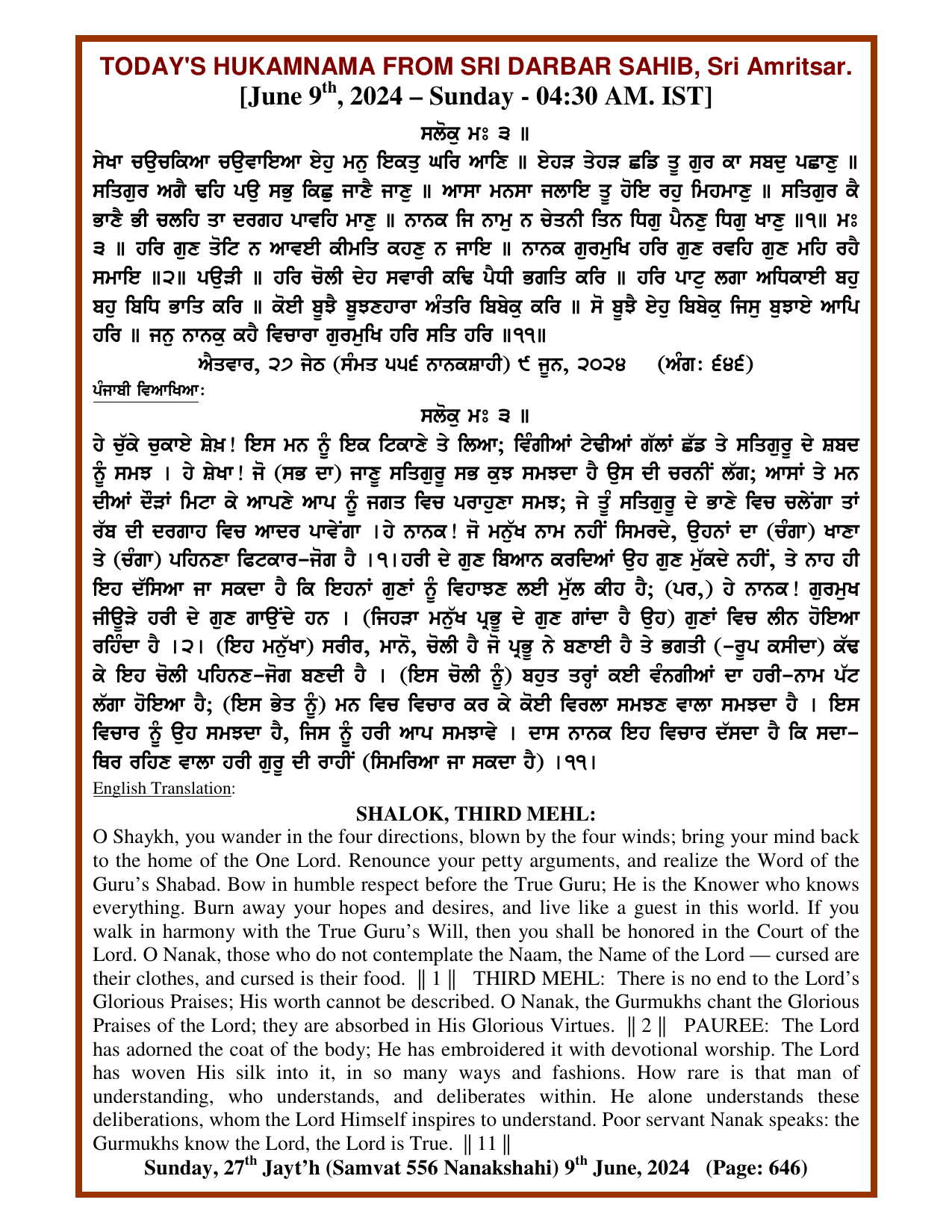 Source : SGPC Post navigation Today’s MUKHWAK Sri Darbar Saheb Amritsar – June 8th, 2024 Today’s MUKHWAK Sri Darbar Saheb Amritsar – June 10th, 2024