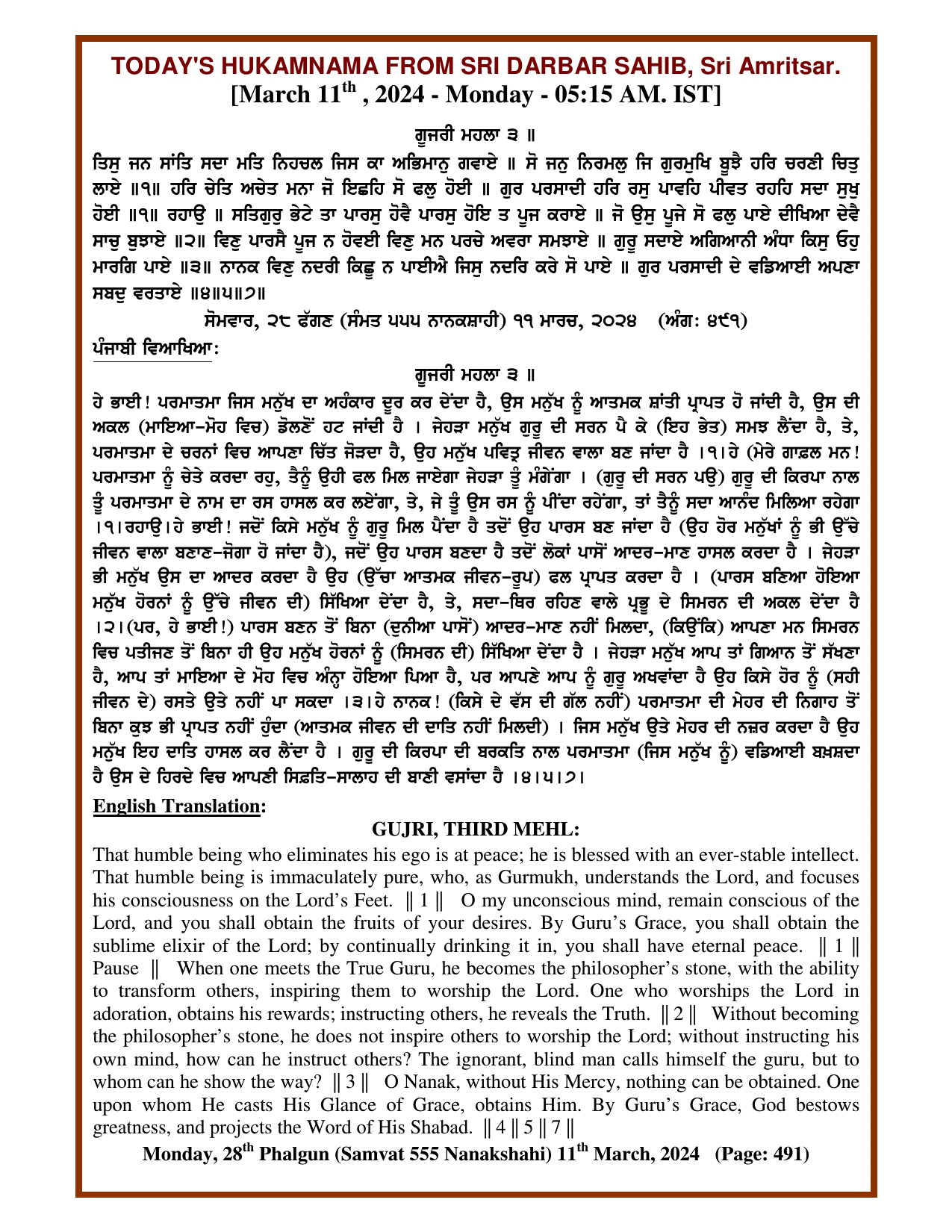 Source : SGPC Post navigation Today’s MUKHWAK Sri Darbar Saheb Amritsar – March 10th, 2024 Today’s MUKHWAK Sri Darbar Saheb Amritsar – March 13th, 2024