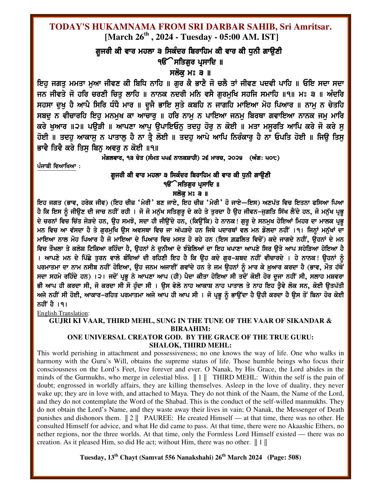 Source : SGPC Post navigation Today’s MUKHWAK Sri Darbar Saheb Amritsar – March 24th, 2024 Today’s MUKHWAK Sri Darbar Saheb Amritsar – March 27th, 2024
