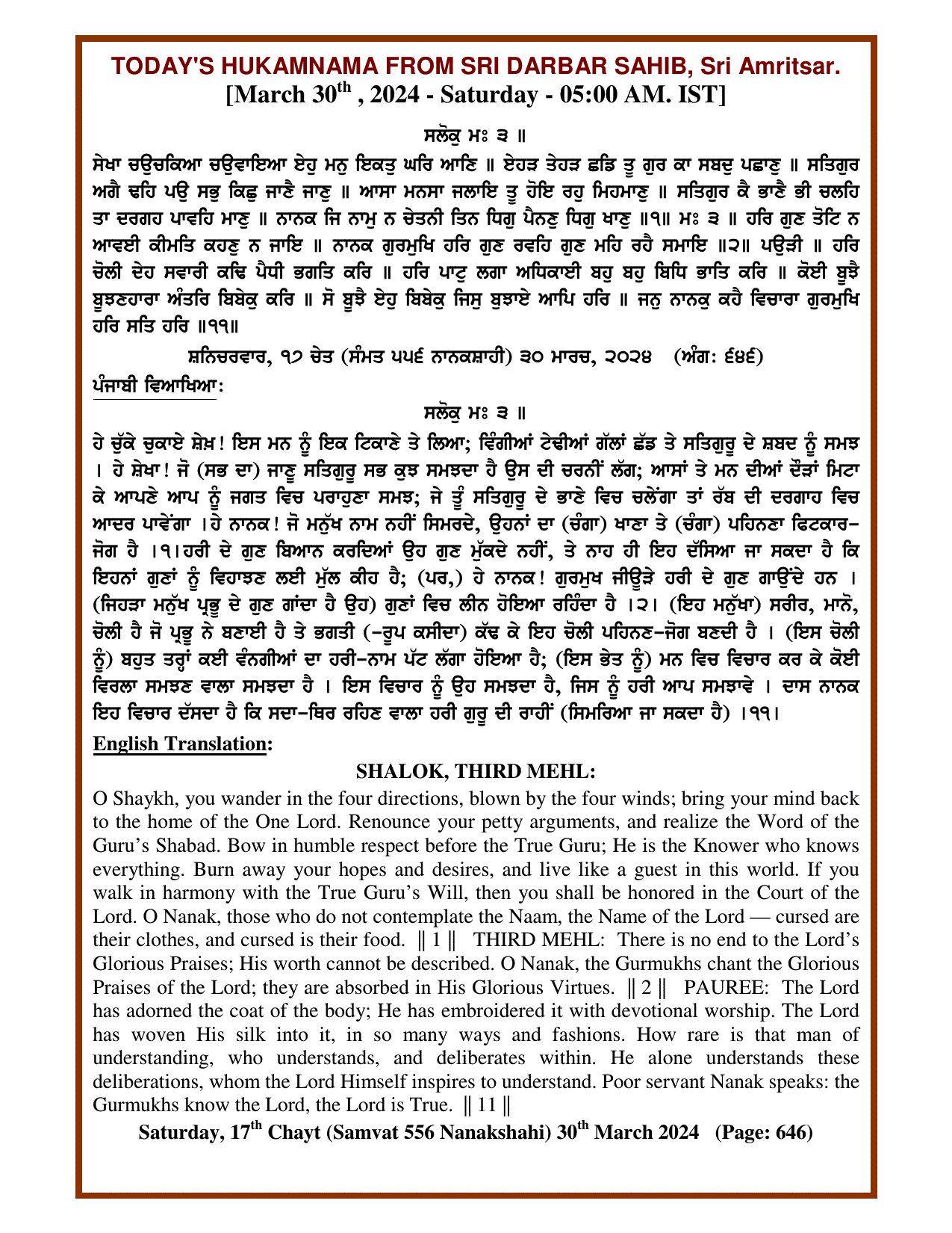 Source : SGPC Post navigation Today’s MUKHWAK Sri Darbar Saheb Amritsar – March 29th, 2024 Today’s MUKHWAK Sri Darbar Saheb Amritsar – March 31st, 2024