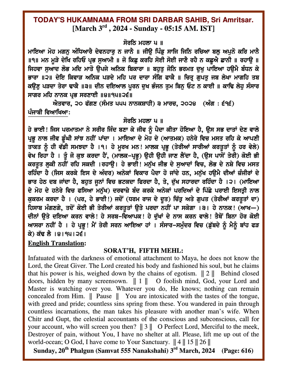 Source : SGPC Post navigation Today’s MUKHWAK Sri Darbar Saheb Amritsar – February 24th, 2024 Today’s MUKHWAK Sri Darbar Saheb Amritsar – March 4th, 2024