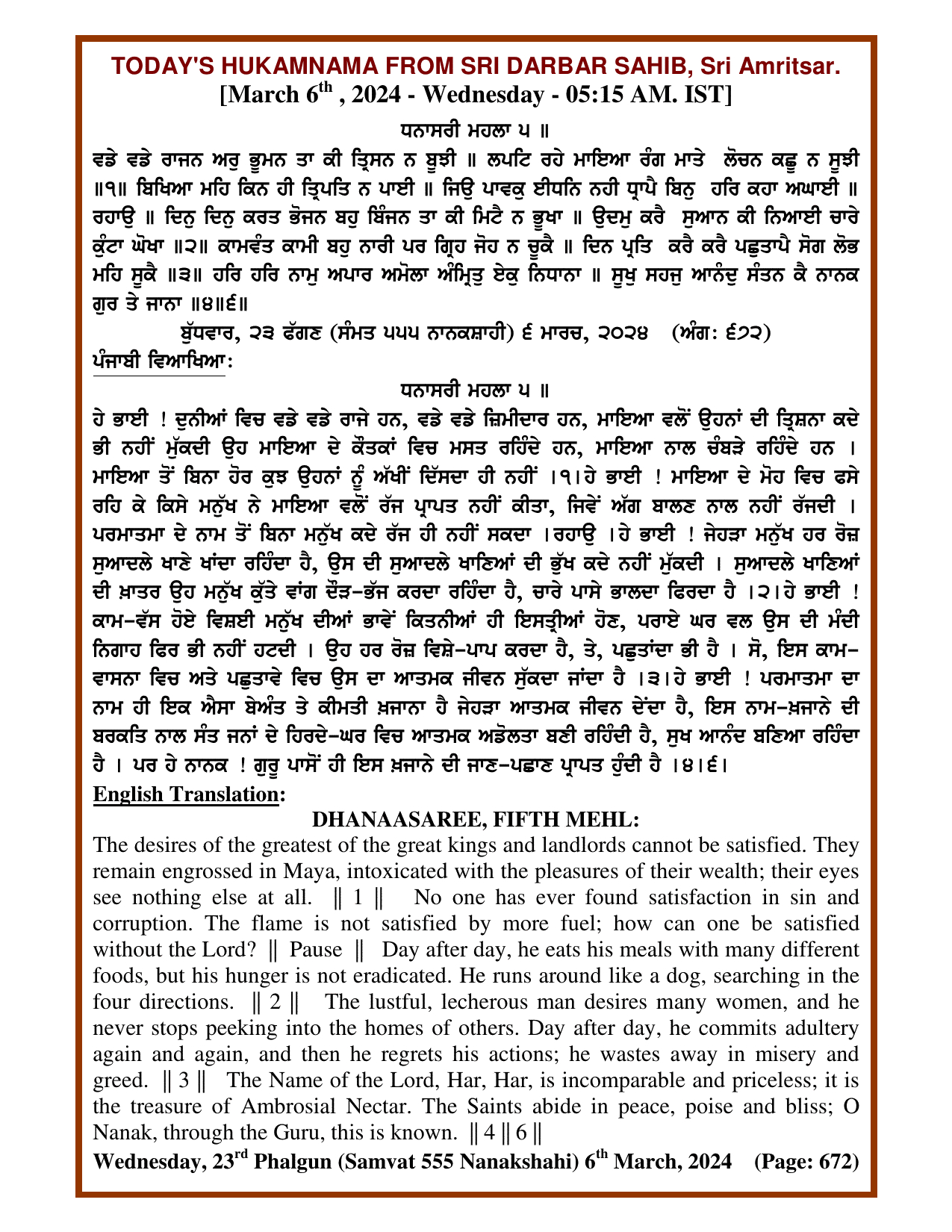 Source : SGPC Post navigation Today’s MUKHWAK Sri Darbar Saheb Amritsar – March 5th, 2024 Today’s MUKHWAK Sri Darbar Saheb Amritsar – March 7th, 2024