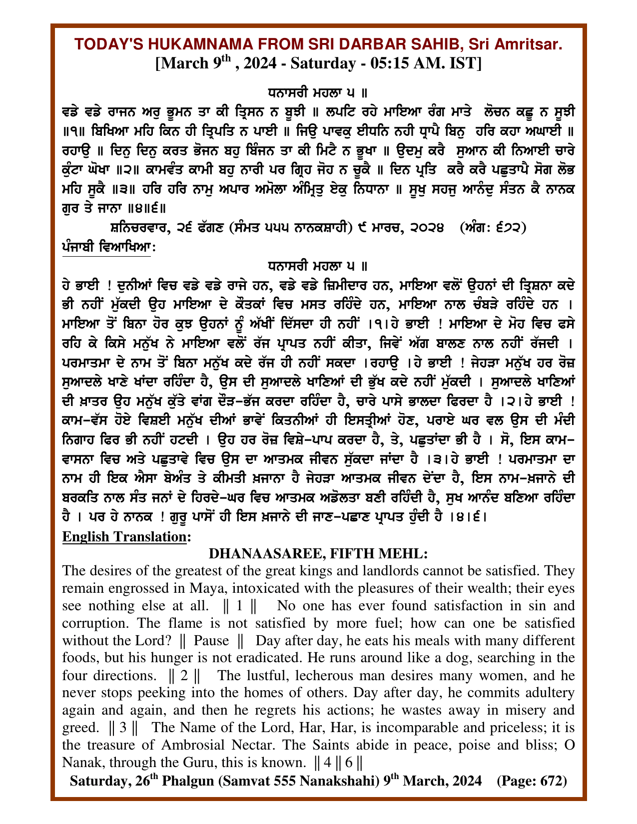 Source : SGPC Post navigation Today’s MUKHWAK Sri Darbar Saheb Amritsar – March 8th, 2024 Today’s MUKHWAK Sri Darbar Saheb Amritsar – March 10th, 2024