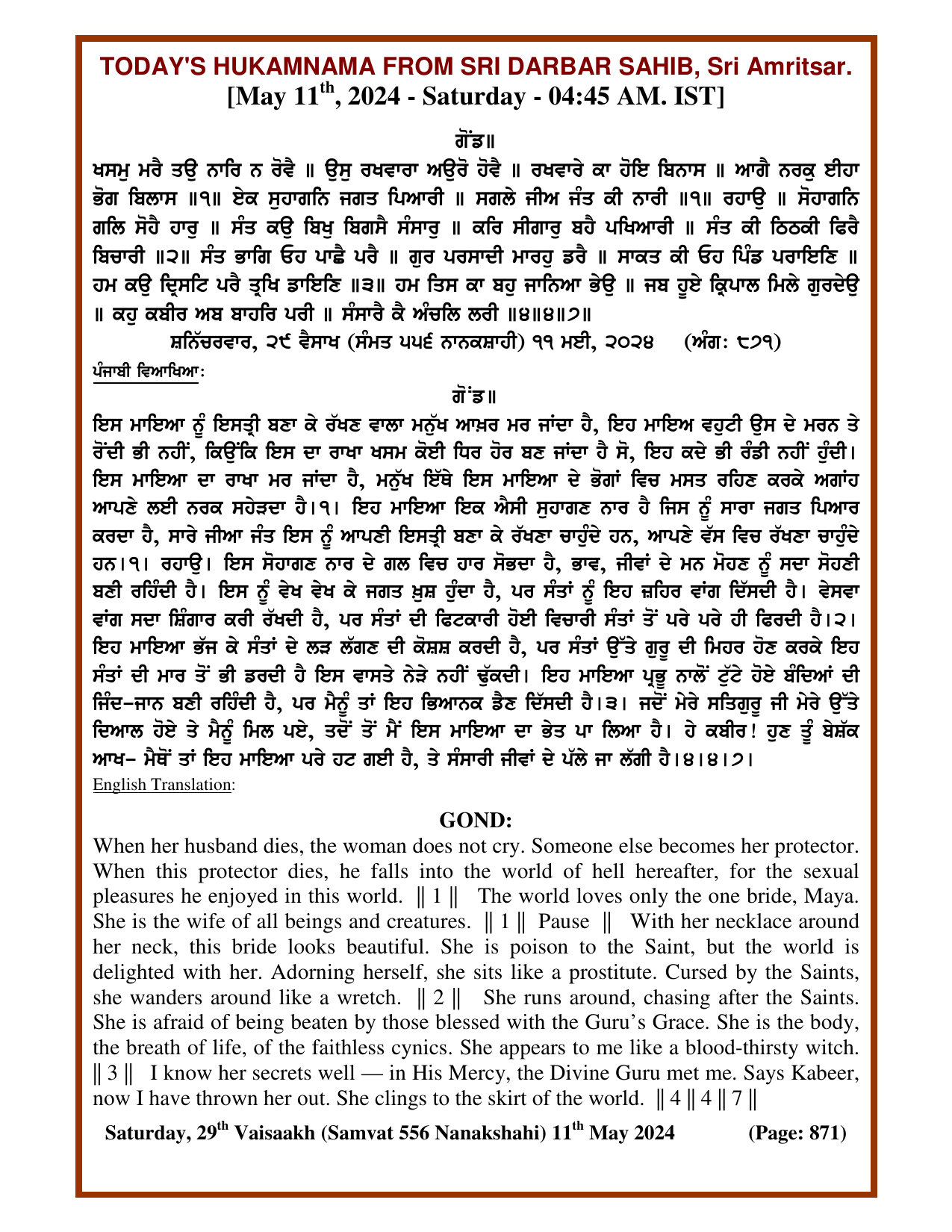 Source : SGPC Post navigation Today’s MUKHWAK Sri Darbar Saheb Amritsar – May 10th, 2024 Today’s MUKHWAK Sri Darbar Saheb Amritsar – May 12th, 2024