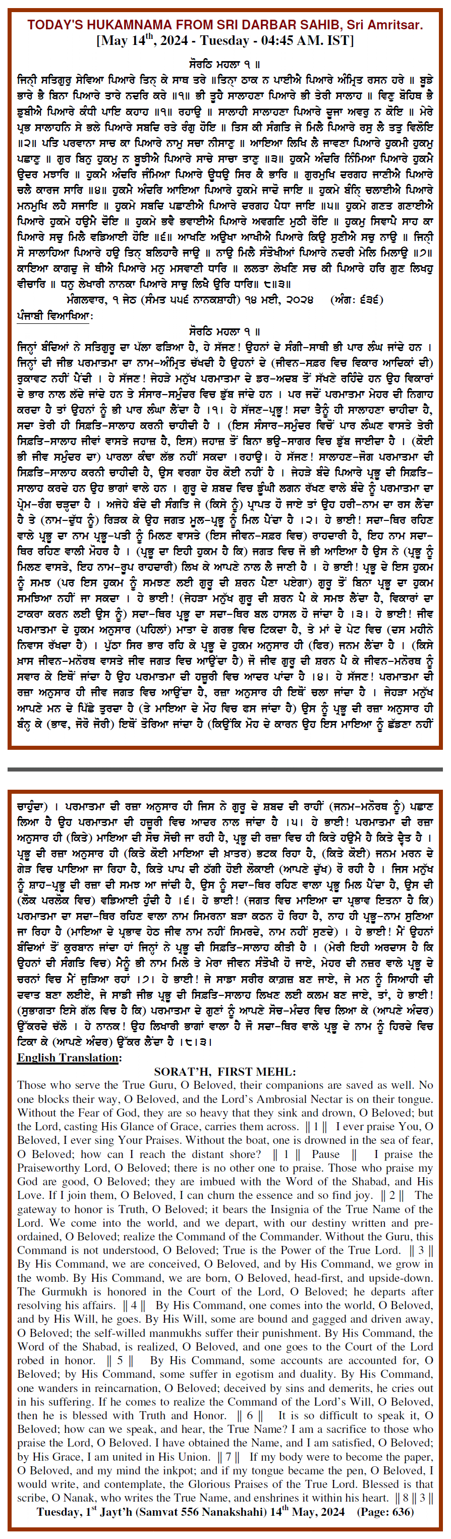 Source : SGPC Post navigation Today’s MUKHWAK Sri Darbar Saheb Amritsar – May 13th, 2024 Today’s MUKHWAK Sri Darbar Saheb Amritsar – May 15th, 2024