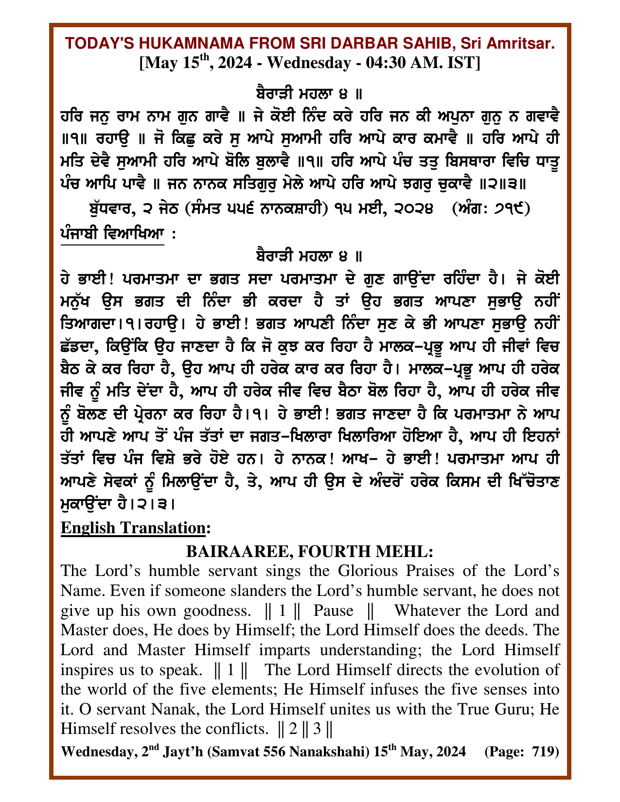Source : SGPC Post navigation Today’s MUKHWAK Sri Darbar Saheb Amritsar – May 14th, 2024 Today’s MUKHWAK Sri Darbar Saheb Amritsar – May 16th, 2024