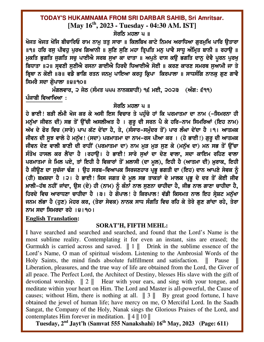 Source : SGPC Post navigation Today’s MUKHWAK Sri Darbar Saheb Amritsar – May 15th, 2023 Today’s MUKHWAK Sri Darbar Saheb Amritsar – May 17th, 2023