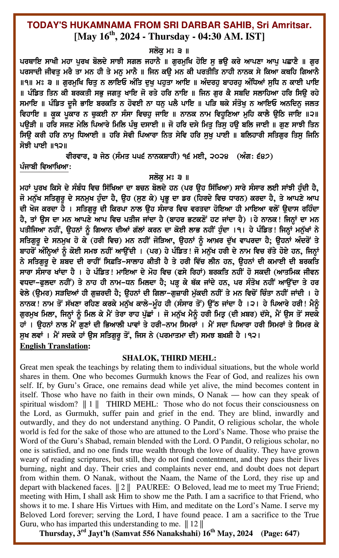 Source : SGPC Post navigation Today’s MUKHWAK Sri Darbar Saheb Amritsar – May 15th, 2024 Today’s MUKHWAK Sri Darbar Saheb Amritsar – May 17th, 2024