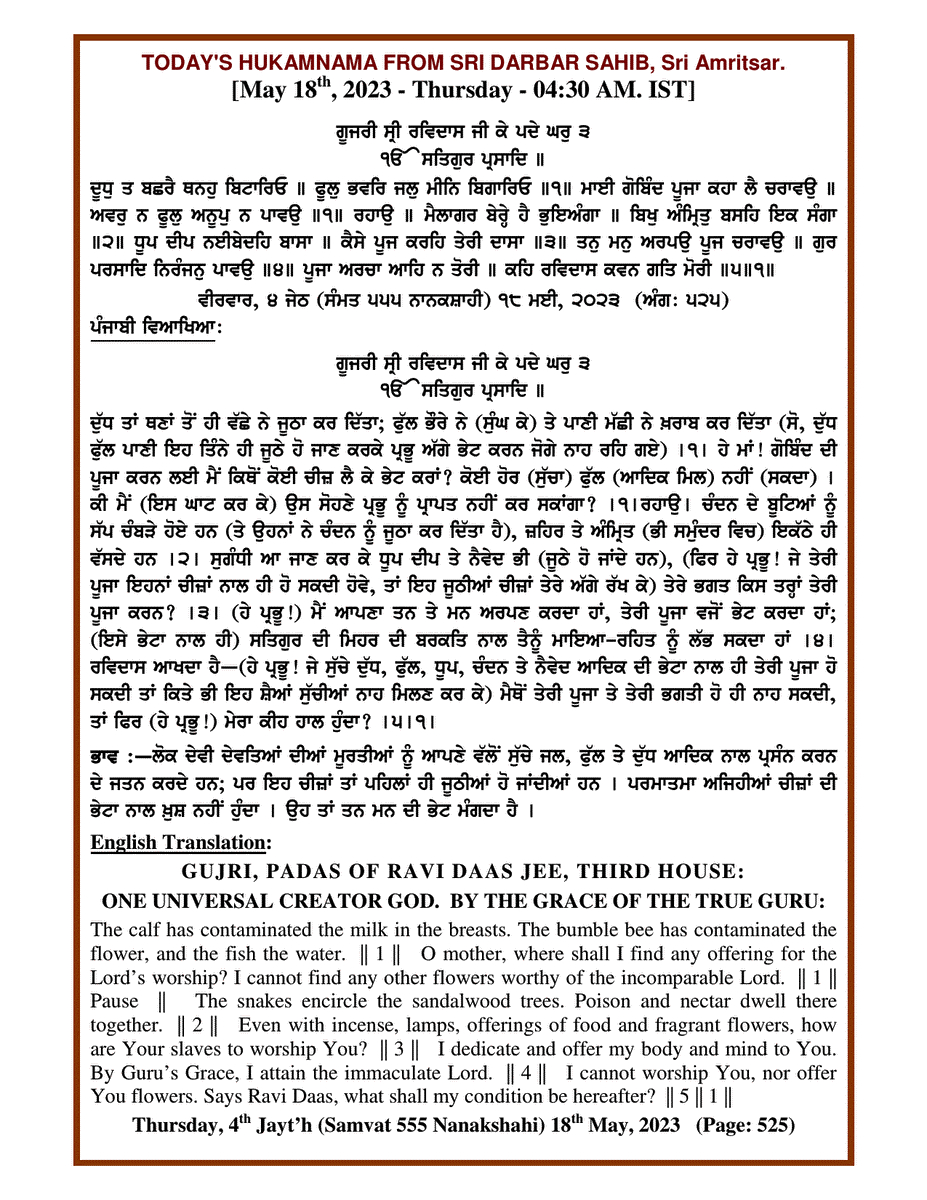 Source : SGPC Post navigation Today’s MUKHWAK Sri Darbar Saheb Amritsar – May 17th, 2023 Today’s MUKHWAK Sri Darbar Saheb Amritsar – May 19th, 2023