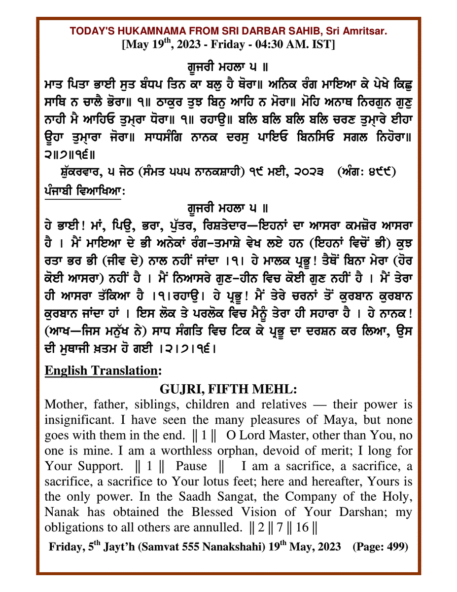 Source : SGPC Post navigation Today’s MUKHWAK Sri Darbar Saheb Amritsar – May 18th, 2023 Today’s MUKHWAK Sri Darbar Saheb Amritsar – May 20th, 2023
