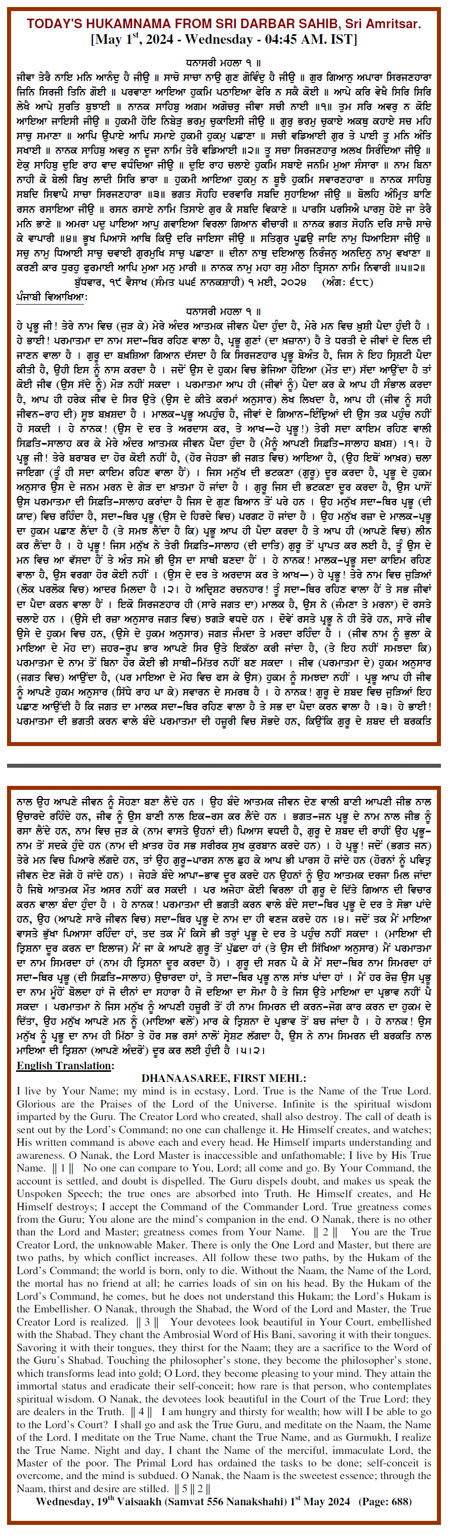 Source : SGPC Post navigation Today’s MUKHWAK Sri Darbar Saheb Amritsar – April 30th, 2024 Today’s MUKHWAK Sri Darbar Saheb Amritsar – May 2nd, 2024