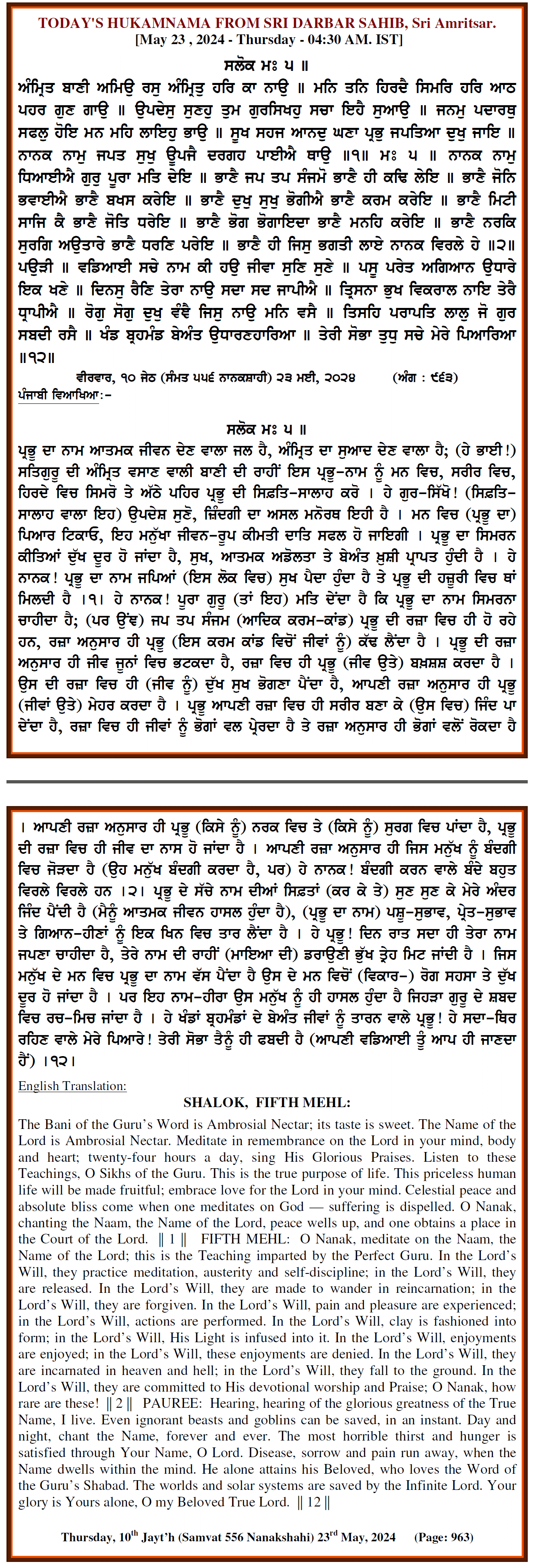 Source : SGPC Post navigation Today’s MUKHWAK Sri Darbar Saheb Amritsar – May 22nd, 2024 Today’s MUKHWAK Sri Darbar Saheb Amritsar – May 24th, 2024