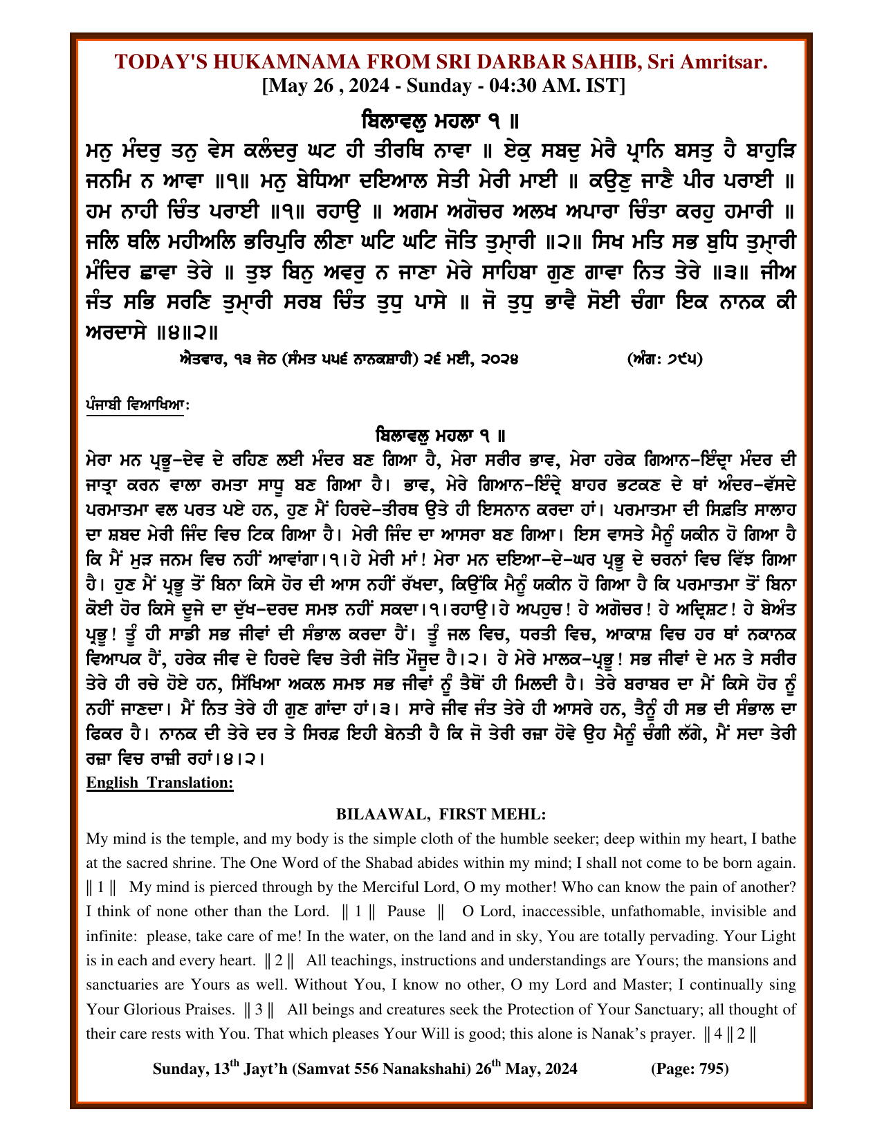 Source : SGPC Post navigation Today’s MUKHWAK Sri Darbar Saheb Amritsar – May 25th, 2024 Today’s MUKHWAK Sri Darbar Saheb Amritsar – May 27th, 2024